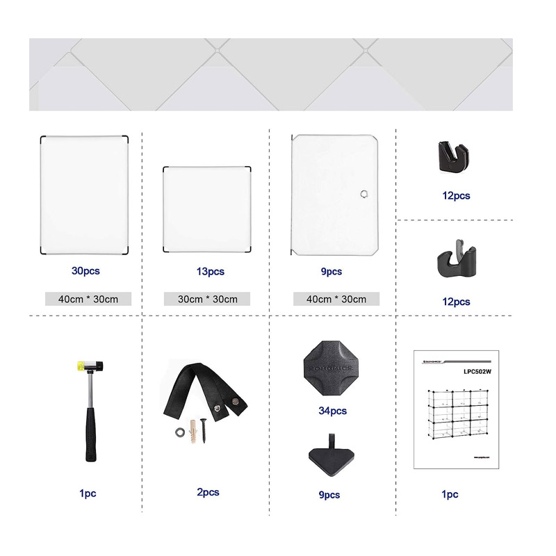 Οδηγίες Συναρμολόγησης: Απλώς τοποθετήστε τα πάνελ στις υποδοχές των βυσμάτων, χτυπήστε με το παρεχόμενο μικρό σφυρί, κουμπώστε τα άγκιστρα με ένα κλικ και στερεώστε τα διαχωριστικά όπως χρειάζεται.