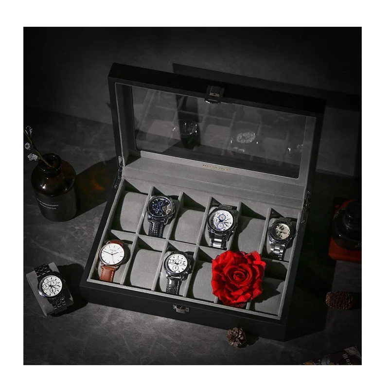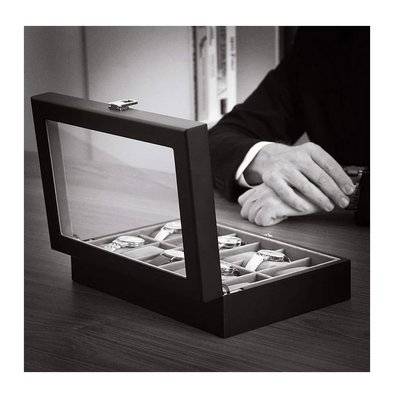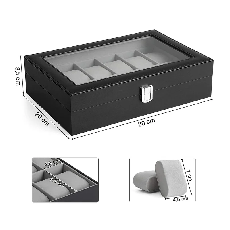 Η θήκη, από την εταιρία Songmics, διαθέτει 12 διαμερίσματα που θα σας επιτρέψουν να προστατέψετε με ασφάλεια τα πολυτελή ρολόγια σας από φθορές, γρατζουνιές και λεκέδες, γεγονός που βοηθά στην εξοικονόμηση σε επισκευές. Κατασκευασμένη από MDF, με υψηλής ποιότητας επιφάνεια PU και απαλή γκρι βελούδινη επένδυση, κλείνει με μεταλλικό κούμπωμα, για μεγαλύτερη ασφάλεια ενώ το διάφανο, γυάλινο παράθυρο στο πάνω μέρος της σας επιτρέπει να εντοπίζετε εύκολα το ρολόι που επιθυμείτε.