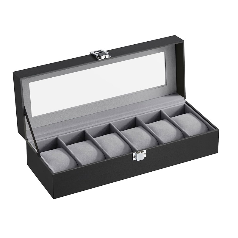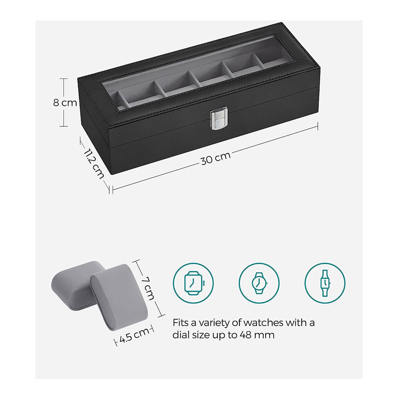 Η κοσμηματοθήκη – μπιζουτιέρα από την εταιρεία Songmics, διαθέτει 6 διαμερίσματα, με αφαιρούμενα ένθετα που μπορούν να τοποθετηθούν υπό γωνία ή να αφαιρεθούν εντελώς. Μπορείτε να αποθηκεύσετε έως 6 ρολόγια ή διάφορα άλλα κοσμήματα. Το εσωτερικό της είναι γεμισμένο με μαλακό υλικό που προστατεύει τα κοσμήματα από τις γρατζουνιές ενώ εξωτερικά φέρει κομψή επένδυση από συνθετικό δέρμα. Κλειδώνει για να μην ανοίγει εύκολα και έχει ακρυλικό γυαλί στο πάνω μέρος, έτσι ώστε να μπορείτε να βλέπετε τι υπάρχει στο εσωτερικό της.