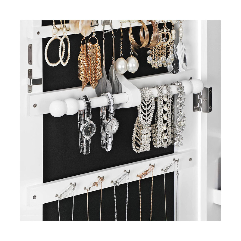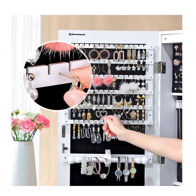 Η κοσμηματοθήκη μπιζουτιέρα, από την εταιρία Songmics, είναι κατασκευασμένη από ανθεκτικό MDF ξύλο για μακροχρόνια χρήση και το εσωτερικό της είναι καλυμμένο από μαλακό ύφασμα. Διαθέτει 5 ράφια, 2 συρτάρια καθώς και πολλούς γάντζους και θήκες για να μπορείτε να αποθηκεύσετε και να οργανώσετε όλα τα κοσμήματα και τα αξεσουάρ σας. Επιπλέον είναι εξοπλισμένη με απαλό φωτισμό LED εσωτερικά, ο οποίος ενεργοποιείται αυτόματα με το άνοιγμα της πόρτας.