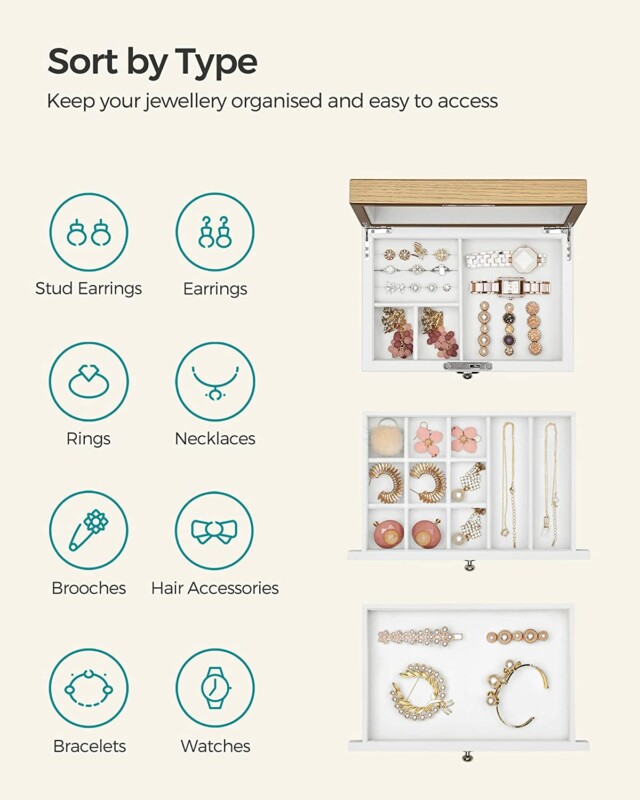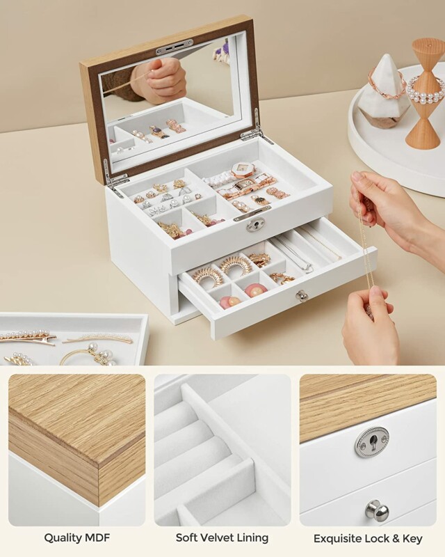 Κομψή & Σικ: Με τις καθαρές γραμμές, το κομψό λευκό πλαίσιο και το καπάκι με πλούσια υφή ξύλου, αυτή η κοσμηματοθήκη 3 επιπέδων φέρνει μια αίσθηση φρεσκάδας και σίγουρα θα αποτελέσει μια σικ προσθήκη στο τραπέζι του καλλωπισμού σας.