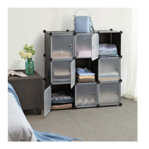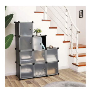 Η παπουτσοθήκη, από την εταιρία Songmics, μπορεί να στηθεί σε διαφορετικά σχήματα, καθιστώντας την ιδανική για διάδρομο, σαλόνι, κάτω από τις σκάλες ή στο γραφείο. Εξοπλισμένη με 9 κύβους αποθήκευσης με πόρτες, που κρατούν μακριά τη σκόνη και τη βρωμιά. Οι κύβοι είναι κατασκευασμένοι από πλαστικά φύλλα PP με στιβαρό μεταλλικό συρμάτινο πλαίσιο και πλαστικούς συνδέσμους ABS. Κάθε κύβος χωράει έως και 10 Kg.