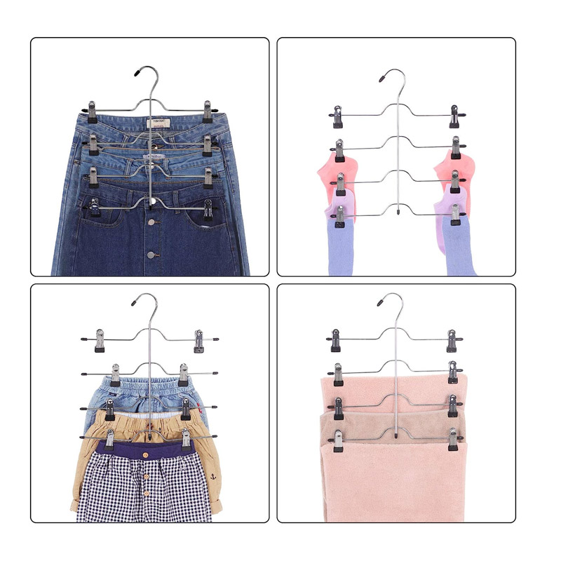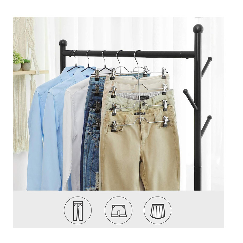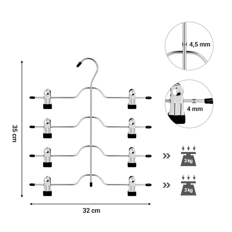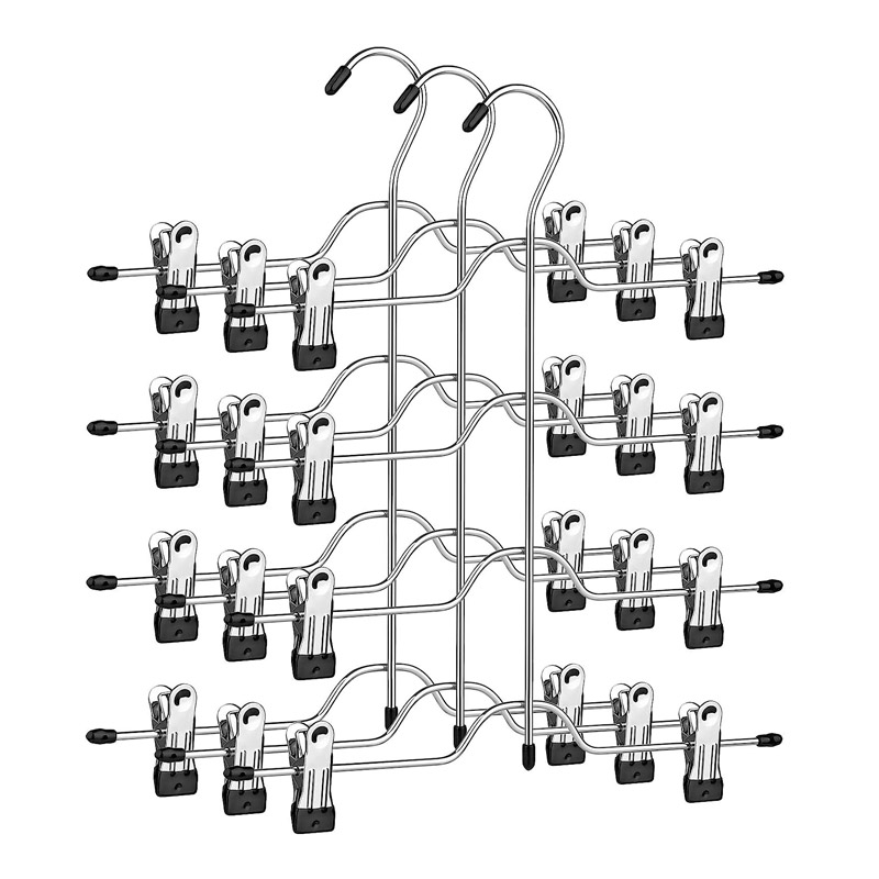 Το σετ, από την εταιρία Songmics, περιλαμβάνει 3 μεταλλικές κρεμάστρες 4 θέσεων σε ασημί χρώμα. Οι κρεμάστρες, διαθέτουν ρυθμιζόμενα κλιπς για να προσαρμόζονται σε διάφορα μεγέθη και στυλ. Τα κλιπς έχουν μύτες επικαλυμμένες με PVC για κρατούν τα παντελόνια σας οργανωμένα και χωρίς ζάρες, επιτρέποντάς σας να επιλέξετε τα καθημερινά σας ρούχα με απόλυτη ηρεμία.