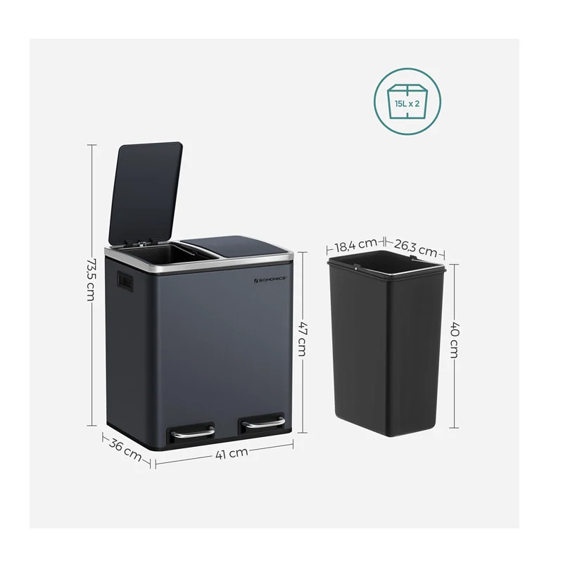 Ο κάδος απορριμμάτων, από την εταιρία Songmics, είναι κατασκευασμένος από ατσάλι. Είναι εξοπλισμένος με 2 αφαιρούμενα πλαστικά διαμερίσματα συνολικής χωρητικότητας 30 Lt (2 x 15 Lt). Είναι εφοδιασμένα με μεταλλικές λαβές μεταφοράς, για να μπορείτε να τα αδειάζετε ξεχωριστά. Επιπρόσθετα, κάθε διαμέρισμα διαθέτει μηχανισμό με αντιολισθητικό πεντάλ, ώστε η απόρριψη των απορριμμάτων να πραγματοποιείται με απολύτως άνετο και υγιεινό τρόπο.