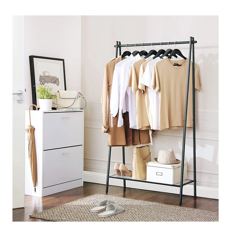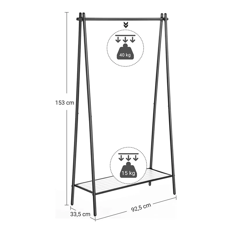 Η κρεμάστρα ρούχων, από την εταιρία Songmics, είναι κατασκευασμένη από ανθεκτικό ατσάλι με σταθερό σχέδιο σε σχήμα Α. Διαθέτει ράγα για ρούχα σε κρεμάστρες με μέγιστο βάρος 40 Kg και ένα επιπλέον ράφι καλυμμένο με πλαστικό πάνελ στο κάτω μέρος για παπούτσια και κουτιά με μέγιστο βάρος 15 Kg.