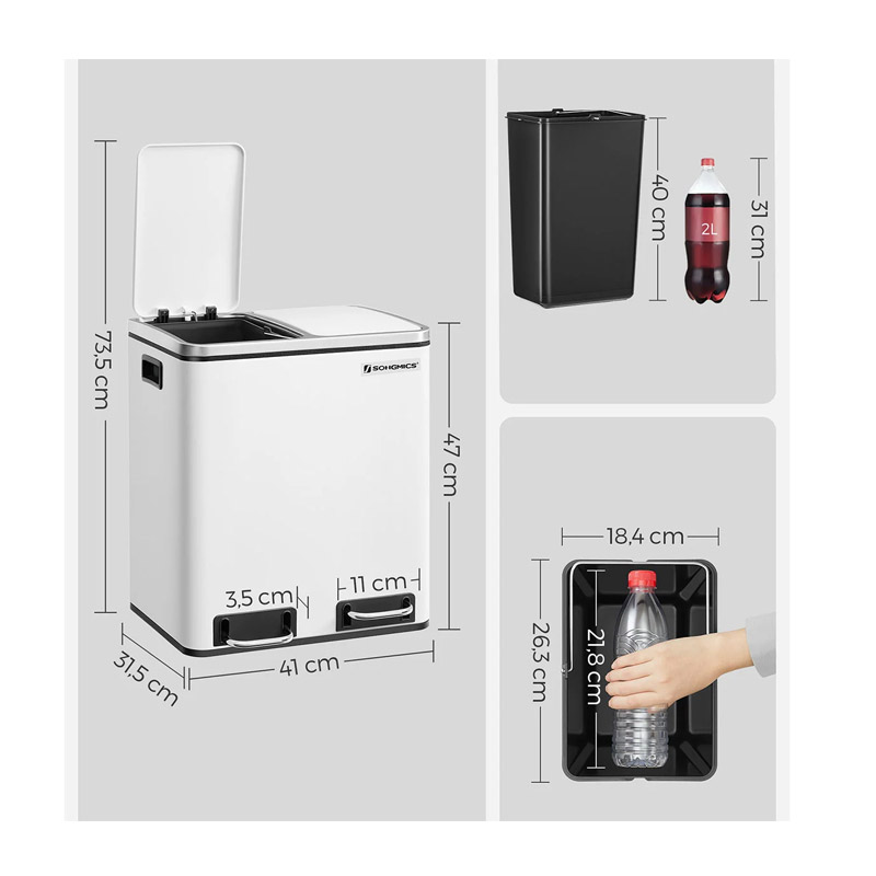 Ο κάδος απορριμμάτων, από την εταιρία Songmics, είναι κατασκευασμένος από ατσάλι. Είναι εξοπλισμένος με 2 αφαιρούμενα πλαστικά διαμερίσματα συνολικής χωρητικότητας 30 Lt (2 x 15 Lt). Είναι εφοδιασμένα με μεταλλικές λαβές μεταφοράς, για να μπορείτε να τα αδειάζετε ξεχωριστά. Επιπρόσθετα, κάθε διαμέρισμα διαθέτει μηχανισμό με αντιολισθητικό πεντάλ, ώστε η απόρριψη των απορριμμάτων να πραγματοποιείται με απολύτως άνετο και υγιεινό τρόπο.