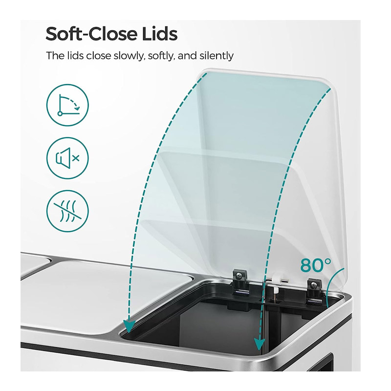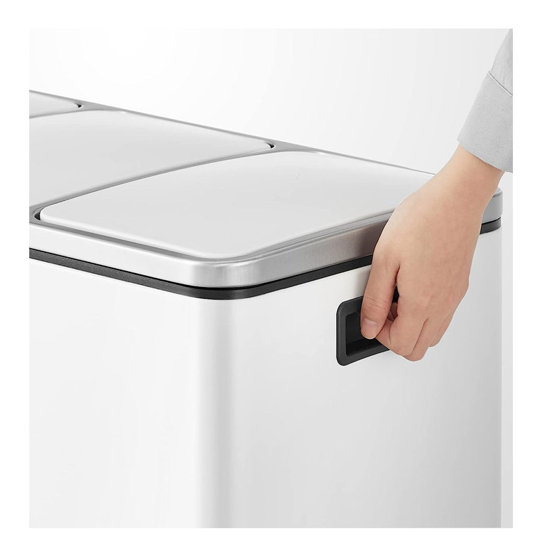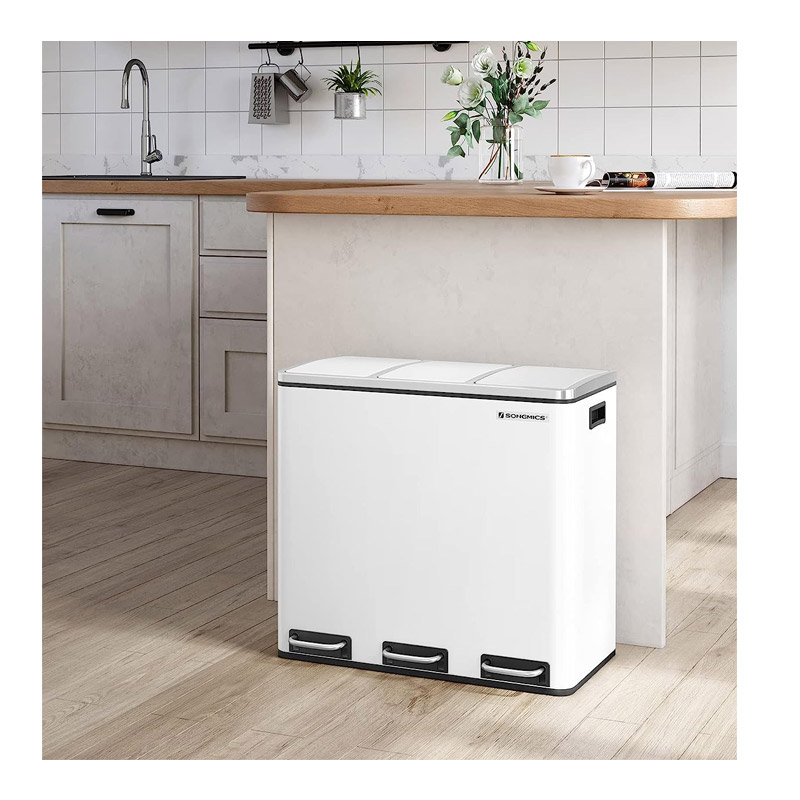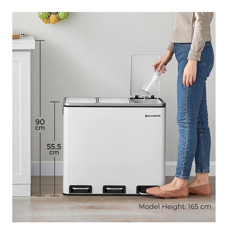 Ο κάδος απορριμμάτων, από την εταιρία Songmics, είναι κατασκευασμένος από ανοξείδωτο ατσάλι με πλαστική βάση. Είναι εξοπλισμένος με 3 αφαιρούμενα πλαστικά διαμερίσματα συνολικής χωρητικότητας 54 Lt (3 x 18 Lt). Είναι εφοδιασμένα με μεταλλικές λαβές μεταφοράς, για να μπορείτε να τα αδειάζετε ξεχωριστά. Επιπρόσθετα, κάθε διαμέρισμα διαθέτει μηχανισμό με αντιολισθητικό πεντάλ, ώστε η απόρριψη των απορριμμάτων να πραγματοποιείται με απολύτως άνετο και υγιεινό τρόπο.