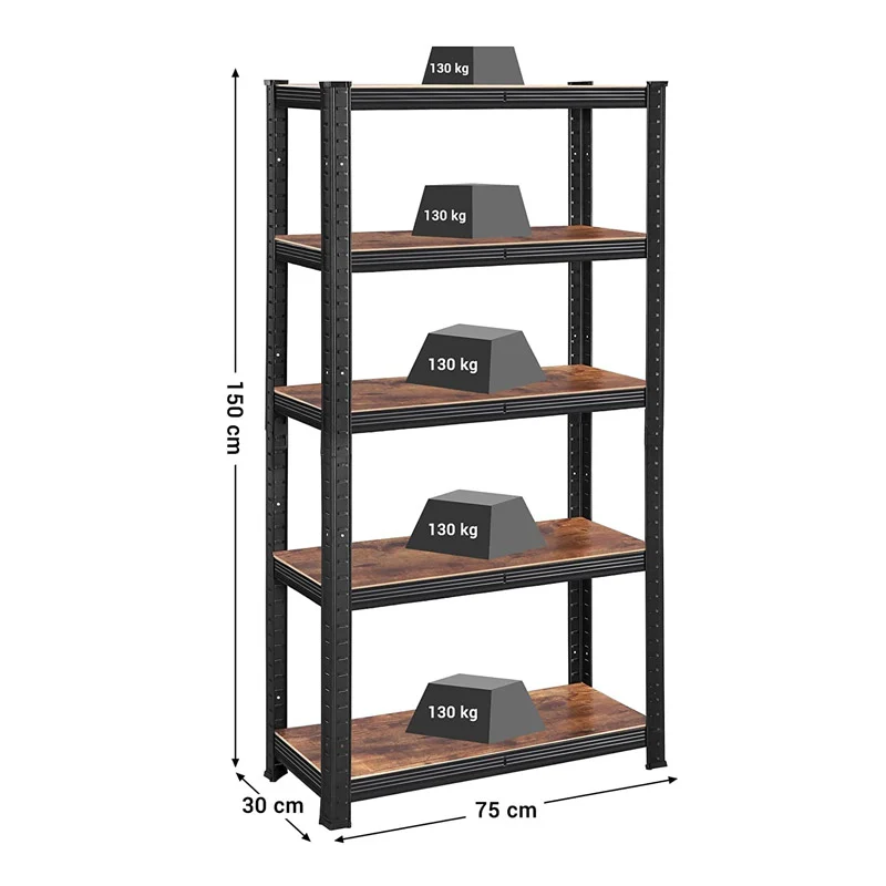 Η ραφιέρα, από την εταιρία Songmics, διαθέτει ατσάλινο πλαίσιο με πρόσθετες ράβδους ενίσχυσης και 5 ξύλινα ράφια από μοριοσανίδα. Κάθε ράφι μπορεί να συγκρατήσει έως και 130 Kg και είναι ρυθμιζόμενο σε ύψος. Η ραφιέρα, μπορεί να χωριστεί σε δύο χαμηλές, ανάλογα με τις ανάγκες σας. Το σύστημα στερέωσης στον τοίχο, σας βοηθά να παραμένει σταθερή και ασφαλή κατά τη χρήση.
