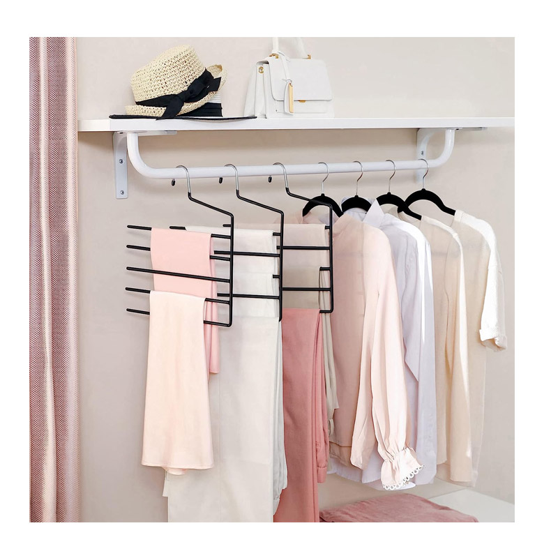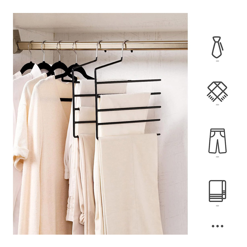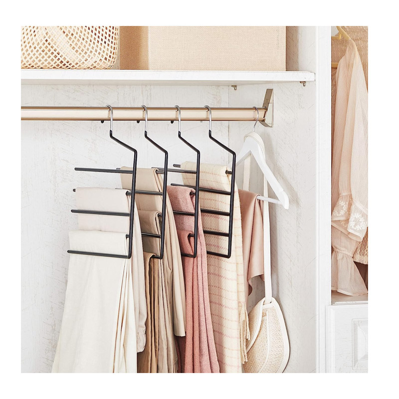Το σετ, από την εταιρία Songmics, αποτελείται από 4 μεταλλικές κρεμάστρες με επίστρωση PVC κατάλληλες για παντελόνια. Κάθε κρεμάστρα έχει 5 θέσεις και μπορεί ν’ αντέξει βάρος έως 4 Kg.