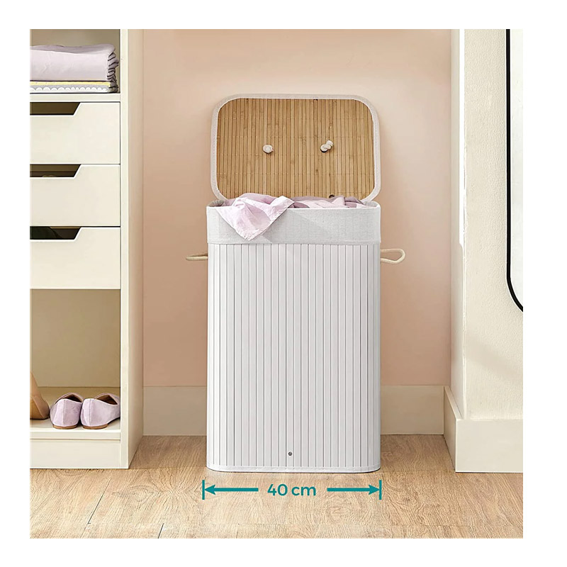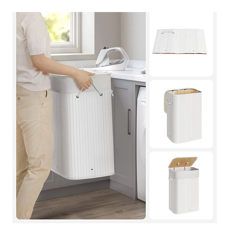 Το καλάθι απλύτων, από την εταιρία Songmics, είναι κατασκευασμένο από φυσικό μπαμπού, ελαφρύ φιλικό προς το περιβάλλον και ελαφρύ, το οποίο αντέχει στις χρήσεις χωρίς να παραμορφώνεται. Στο εσωτερικό διαθέτει τσάντα από βαμβακερό ύφασμα 160 g/m² η οποία αφαιρείται, για να μπορείτε να μεταφέρετε τα ρούχα με άνεση στο πλυντήριο.