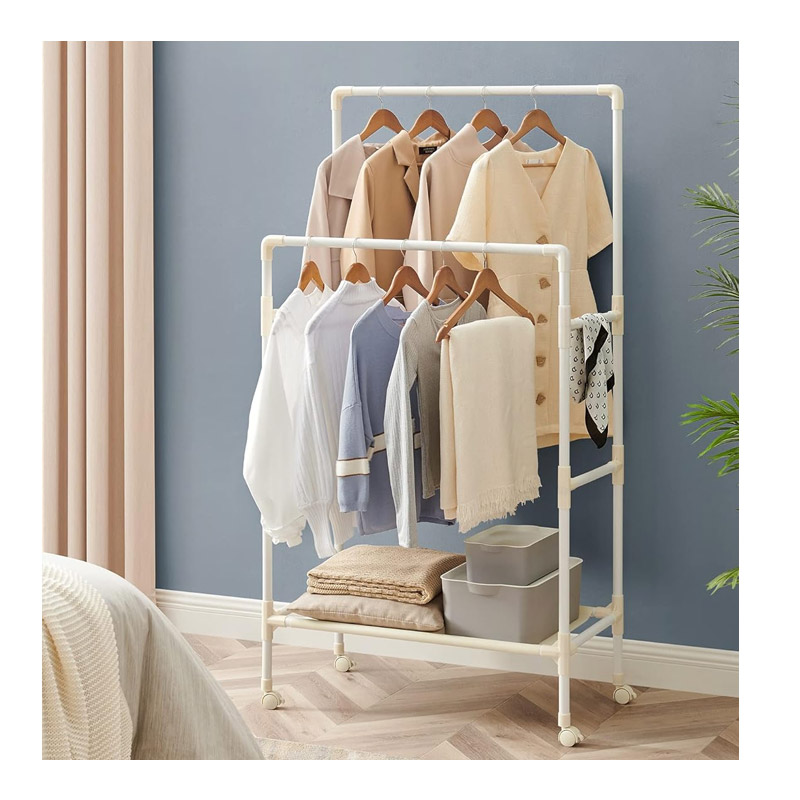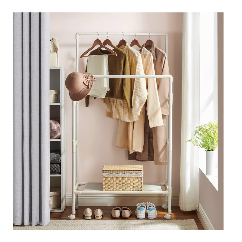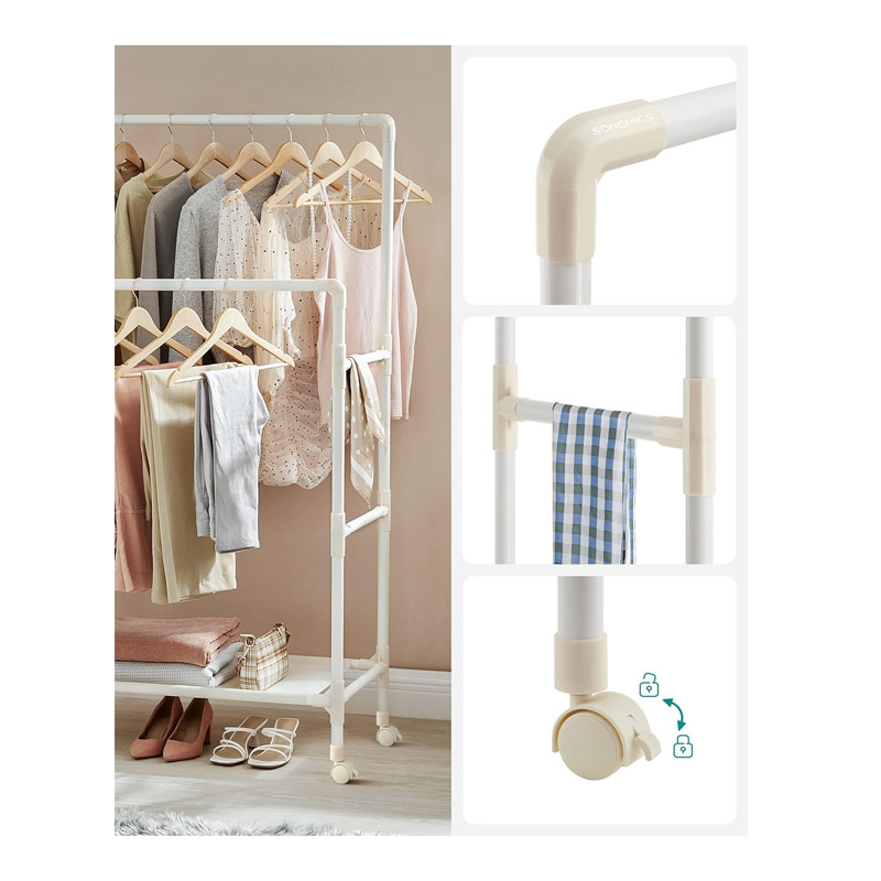 Η κρεμάστρα ρούχων, από την εταιρία Songmics, διαθέτει μεταλλικούς σωλήνες από ατσάλι, εξασφαλίζοντας ανώτερη αντοχή και σταθερότητα, με μέγιστο βάρος τα 55 Kg. Είναι ιδανική για παλτό, φορέματα, πουκάμισα και διάφορα ρούχα τα οποία θέλετε να έχετε πάντα τακτοποιημένα. Είναι εξοπλισμένη με 2 ράγες, επιπρόσθετο ράφι από μη υφασμένο ύφασμα 110 g/m² στο κάτω μέρος για παπούτσια και 4 πλευρικές μπάρες, ιδανικές για κασκόλ, φουλάρια κλπ. Οι 4 τροχοί με φ΄ρενα διευκολύνουν την μετακίνησή της.