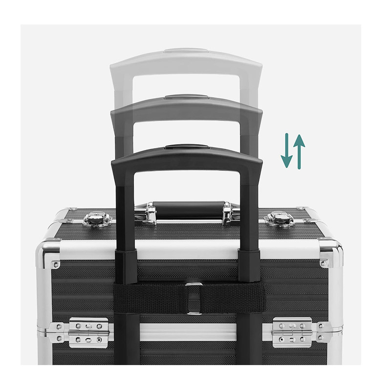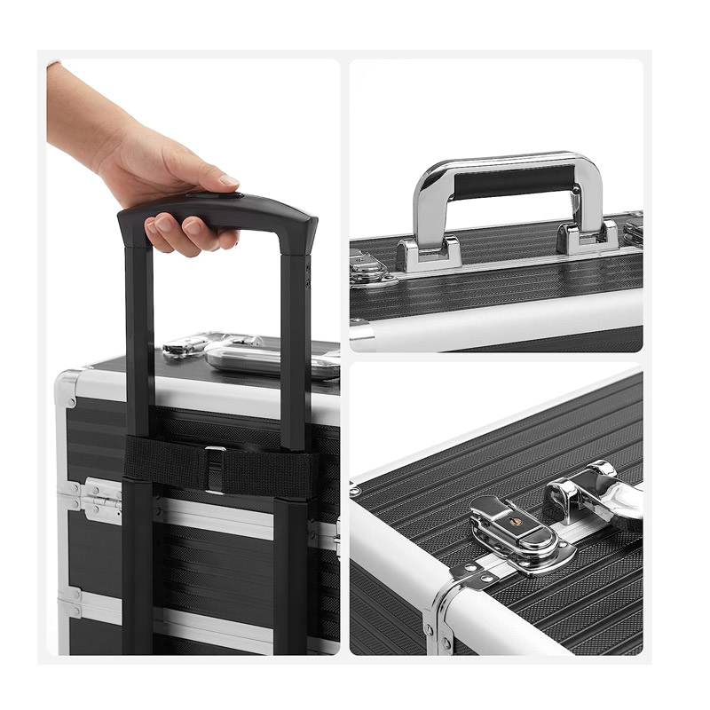 Η βαλίτσα διαθέτει επιφάνεια από MDF καλυμμένη από ABS, λωρίδες από αλουμίνιο και μεταλλικές γωνίες για την προστασία των πολύτιμων αντικειμένων σας από ζημιές. Αποτελείται από 3 επίπεδα, με το πάνω επίπεδο να ανοίγει σε στιλ ακορντεόν, για να τοποθετείτε καλλυντικά, προϊόντα styling και μακιγιάζ, ενώ στο μεγάλο επίπεδο στο κάτω μέρος μπορείτε να αποθηκεύσετε μεγάλα αντικείμενα όπως λάμπες νυχιών UV και στεγνωτήρες μαλλιών. Εξοπλισμένη με τηλεσκοπική λαβή και 4 τροχούς για εύκολη μεταφορά.