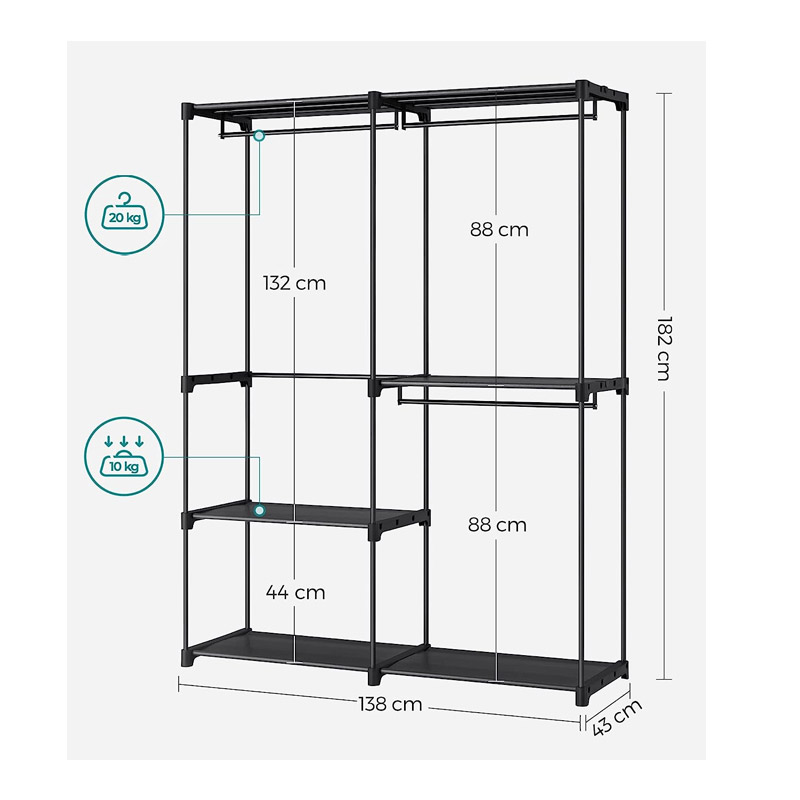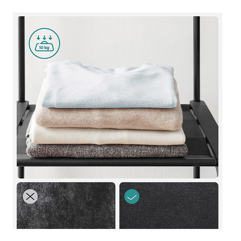 Η ντουλάπα, από την εταιρία Songmics, προσφέρει ανοιχτό χώρο αποθήκευσης για τα ρούχα σας. Κατασκευασμένη με ατσάλινους σωλήνες διαμέτρου 16 mm και ενισχυμένους πλαστικούς συνδέσμους, παρέχει ισχυρή στήριξη στα ρούχα σας. Διαθέτει 3 ράφια και 3 ράγες για ρούχα σε κρεμάστρες ώστε να σας παρέχει επαρκή αποθηκευτικό χώρο όπου τον χρειάζεστε.