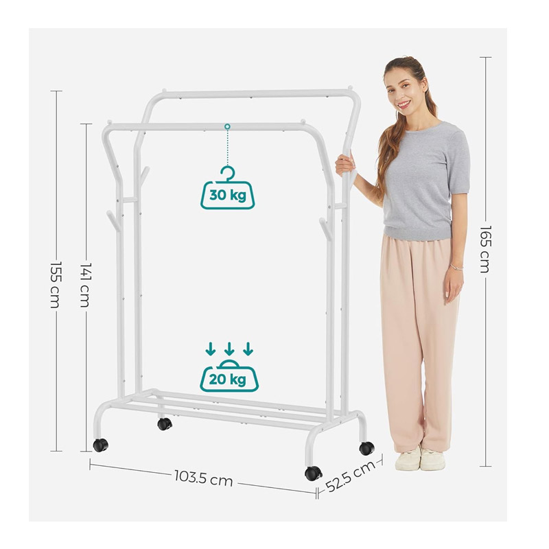 Μεταλλική Διπλή Τροχήλατη Κρεμάστρα Ρούχων Δαπέδου Βαρέως Τύπου 103.5 x 52.5 x 155 cm Χρώματος Λευκό Songmics HSR107W01