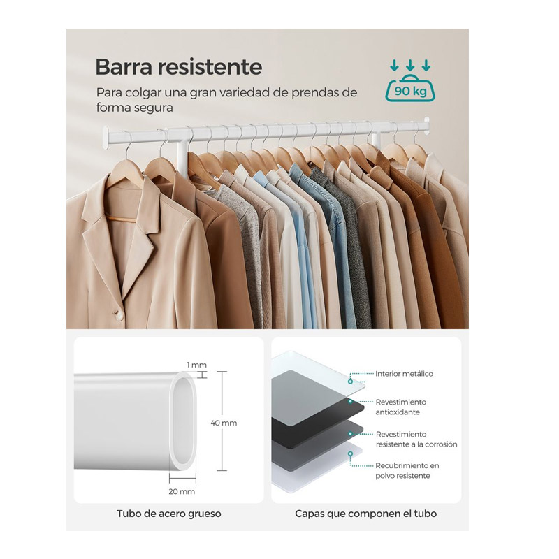 Η κρεμάστρα ρούχων βαρέως τύπου, από την εταιρία Songmics, διαθέτει μεταλλικούς σωλήνες υψηλής ποιότητας, εξασφαλίζοντας ανώτερη αντοχή και σταθερότητα, με μέγιστο βάρος τα 90 Kg. Είναι ιδανική για παλτό, φορέματα, πουκάμισα και διάφορα ρούχα τα οποία θέλετε να έχετε πάντα τακτοποιημένα.