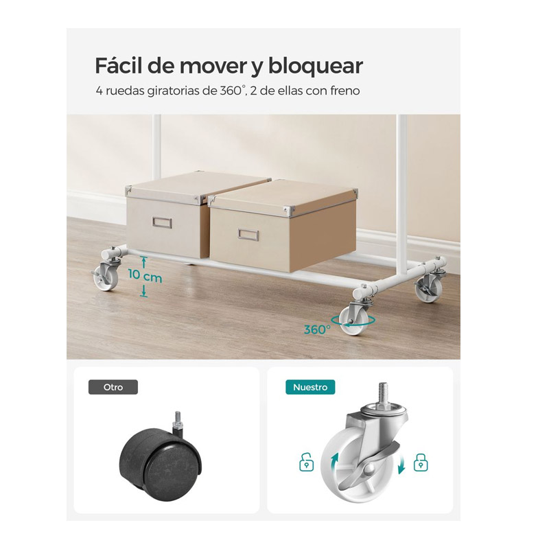 Η κρεμάστρα, στο πάνω μέρος, διαθέτει 2 επεκτάσιμα άκρα (κάθε πλευρά 0-20 cm) και είναι εξοπλισμένη με 4 βιομηχανικές και περιστρεφόμενες ρόδες 360°, κατασκευασμένες από ποιοτικό υλικό, με φρένα ασφάλισης για εύκολη μετακίνηση.