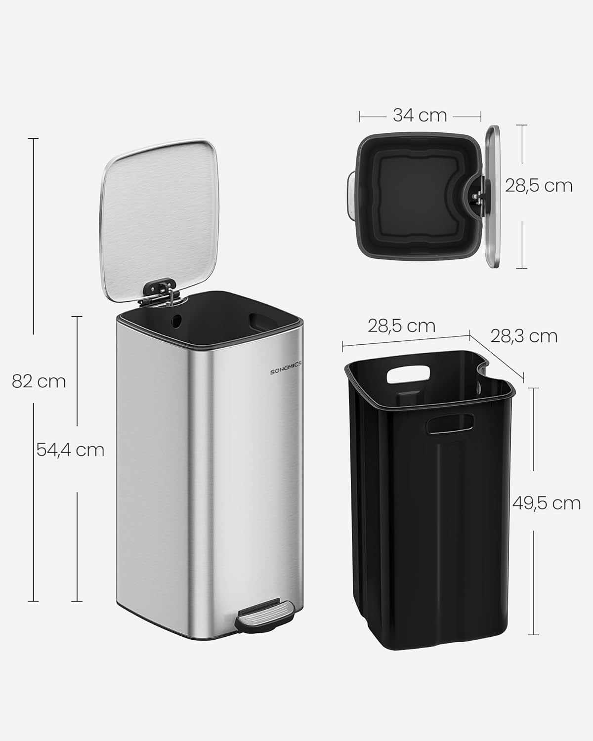 SONGMICS Μεταλλικός Κάδος Απορριμμάτων 30 Λίτρων με Πεντάλ και Εσωτερικό Κουβά, Soft Close, Ασημί LTB593E01