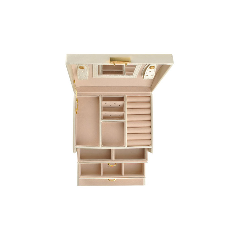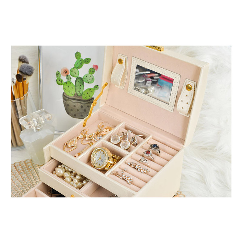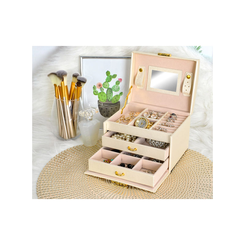 Το εσωτερικό της είναι γεμισμένο με μαλακό υλικό που προστατεύει τα κοσμήματα από τις γρατζουνιές. Κλειδώνει με κλειδί, παρέχοντας έτσι πλήρη ιδιωτικότητα. Ο εσωτερικός καθρέπτης είναι ιδανικός για περιποίηση make-up, ενώ η πρακτική λαβή στο πάνω μέρος την καθιστά εύκολη στη μεταφορά.