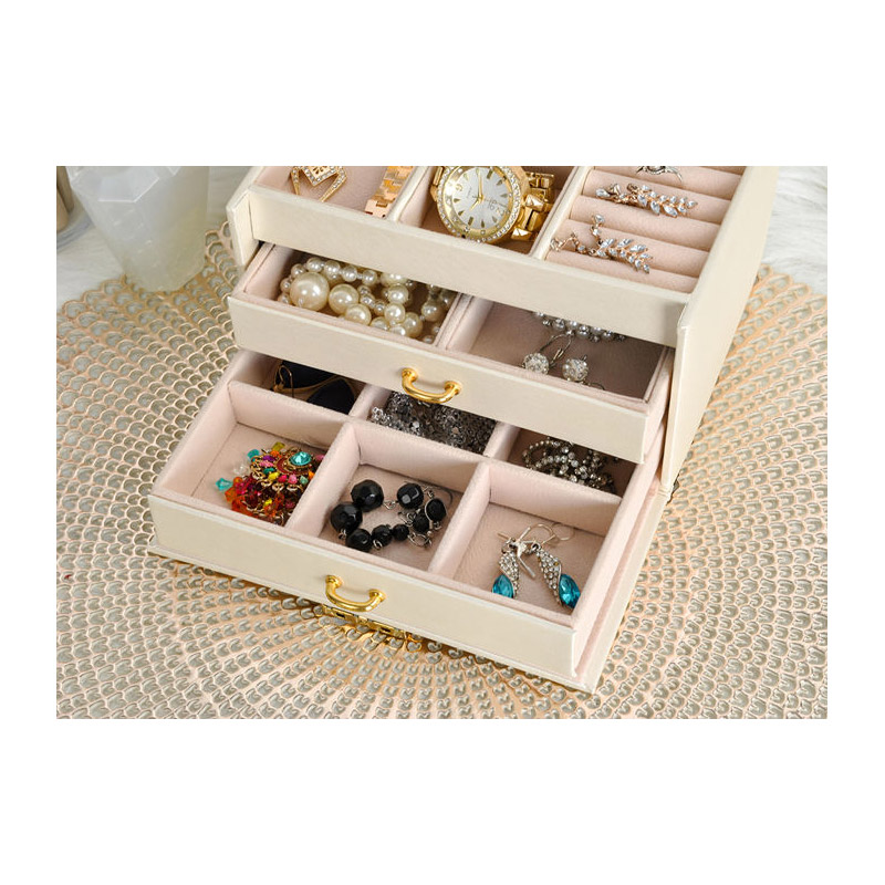 Η κοσμηματοθήκη – μπιζουτιέρα, διαθέτει 20 διαφορετικά διαμερίσματα και ειδικές θήκες που θα σας επιτρέψουν να οργανώσετε τα κοσμήματά σας, γρήγορα και εύκολα. Περιλαμβάνει επίσης, 2 συρτάρια και 1 κρυφό ράφι κάτω από το καπάκι. Τα διαμερίσματα έχουν διαφορετικά μεγέθη, για να αποθηκεύουν ρολόγια, βραχιόλια, περιδέραια, σκουλαρίκια ή ακόμη και USB-stick.