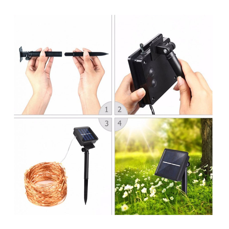 Η ηλιακή διακοσμητική γιρλάντα κήπου, από την εταιρία SPM, διαθέτει μήκος 10 m και είναι εξοπλισμένη με 100 LED με ζεστό λευκό ανοιχτό χρώμα. Δεν χρειάζεται καλωδίωση, καθώς τροφοδοτείται από ηλιακό πάνελ με 8 τρόπους φωτισμού.