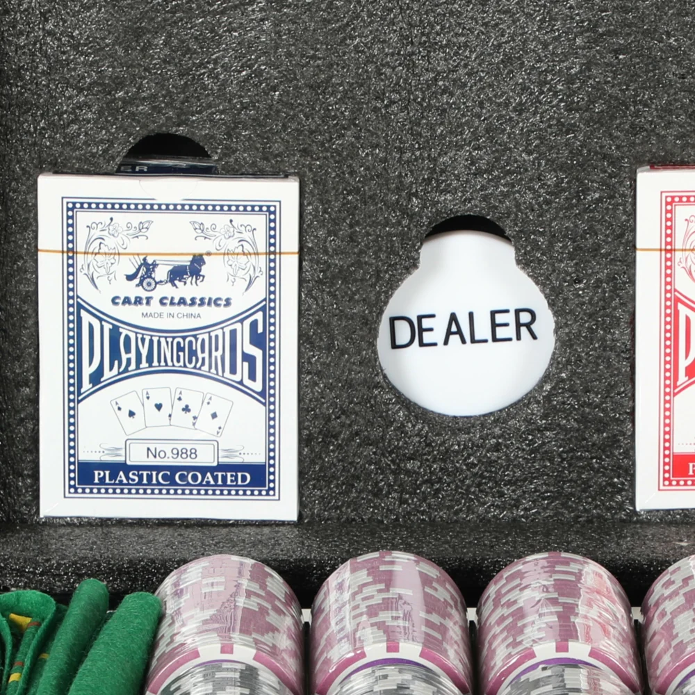 - Πλήρες σετ με 600 μάρκες, 2 τράπουλες, ένα κουμπί dealer και ένα χαλάκι