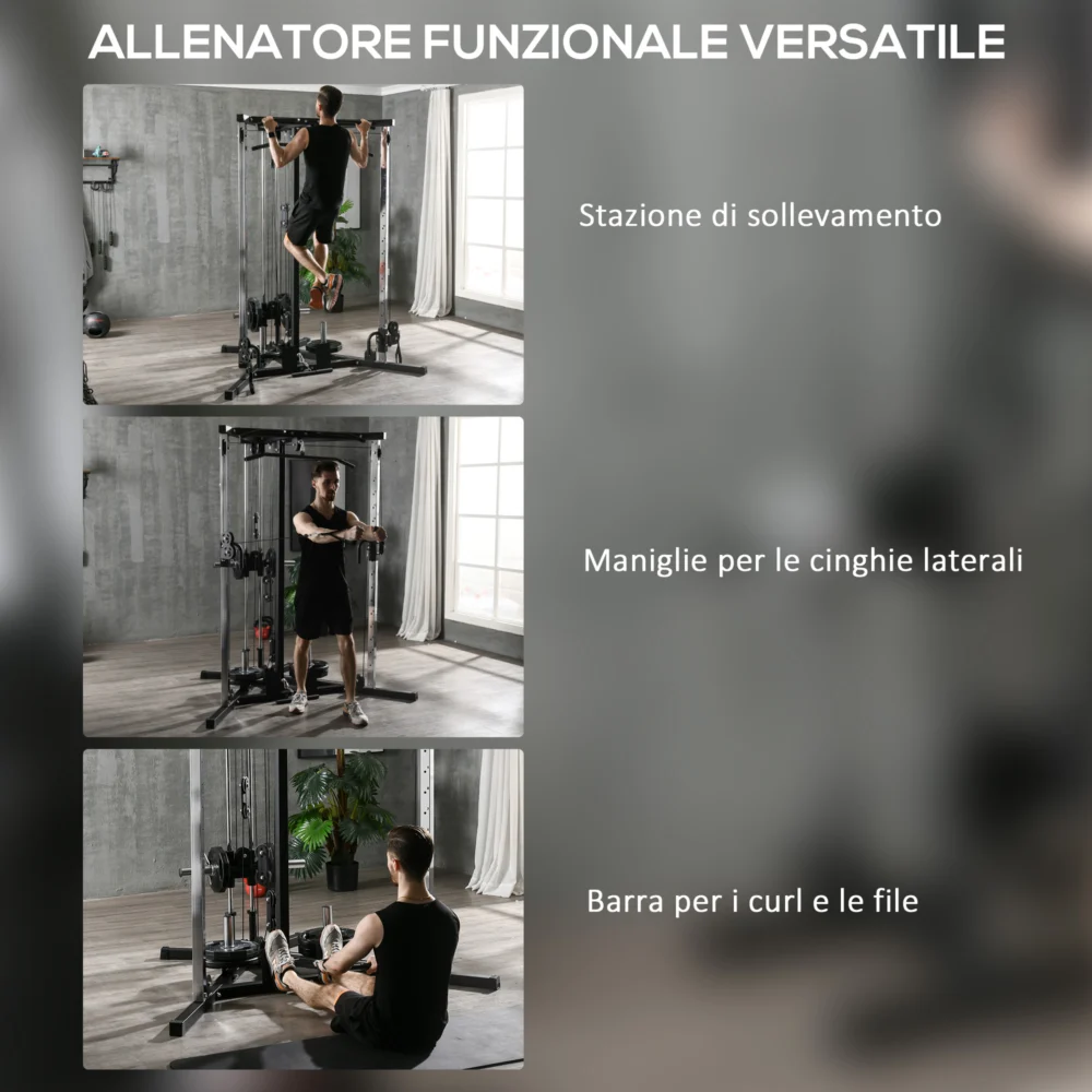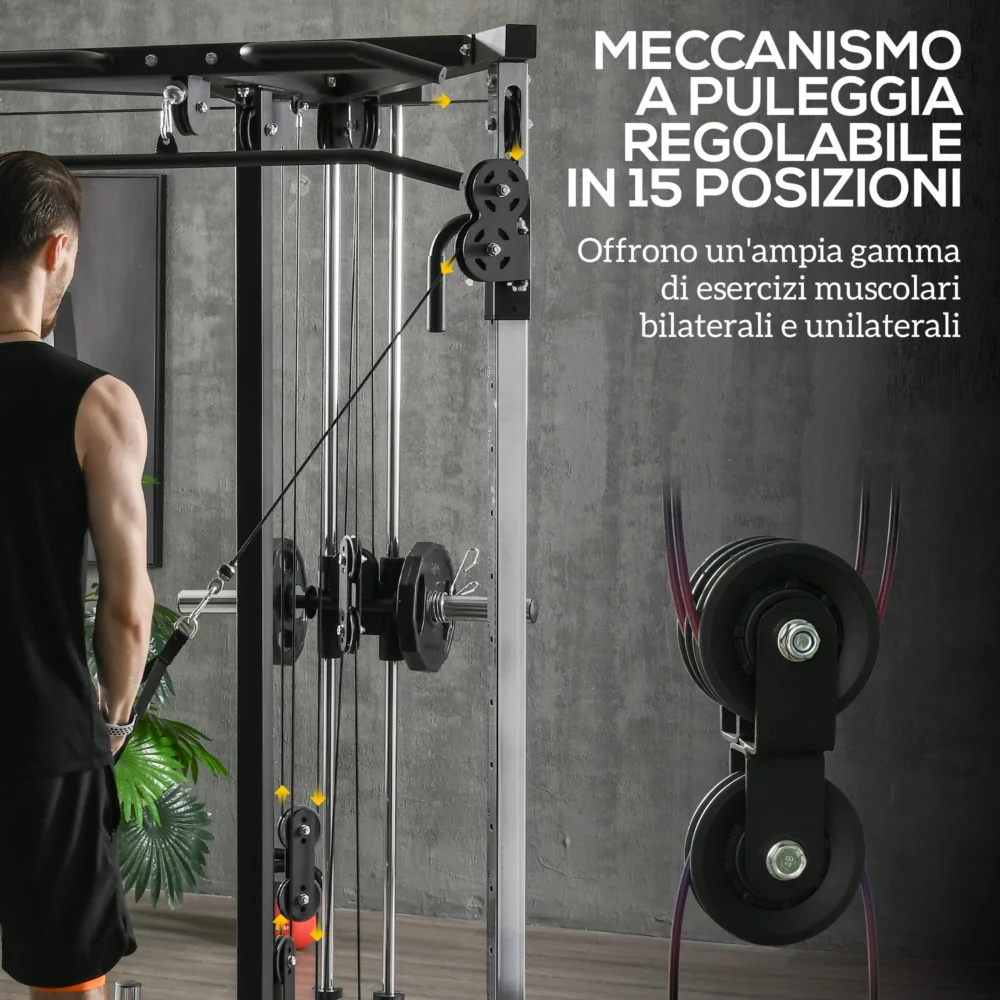 Ο σταθμός γυμναστικής μας αποτελεί σημείο αναφοράς για μια ποικίλη και ολοκληρωμένη προπόνηση στους χώρους του σπιτιού. Αυτή η υποστήριξη επιτρέπει την τόνωση διαφόρων μυϊκών ομάδων απλά ρυθμίζοντας το ύψος του συστήματος διπλής τροχαλίας: μπορείς να εκτελέσεις διμερείς και μονομερείς ασκήσεις για να γυμνάσεις κάθε μυϊκή ομάδα. Μεγιστοποίησε την προπόνηση δύναμης διανέμοντας τα βάρη και ρύθμισε την ένταση της προπόνησης ανάλογα με τις ικανότητές σου!
