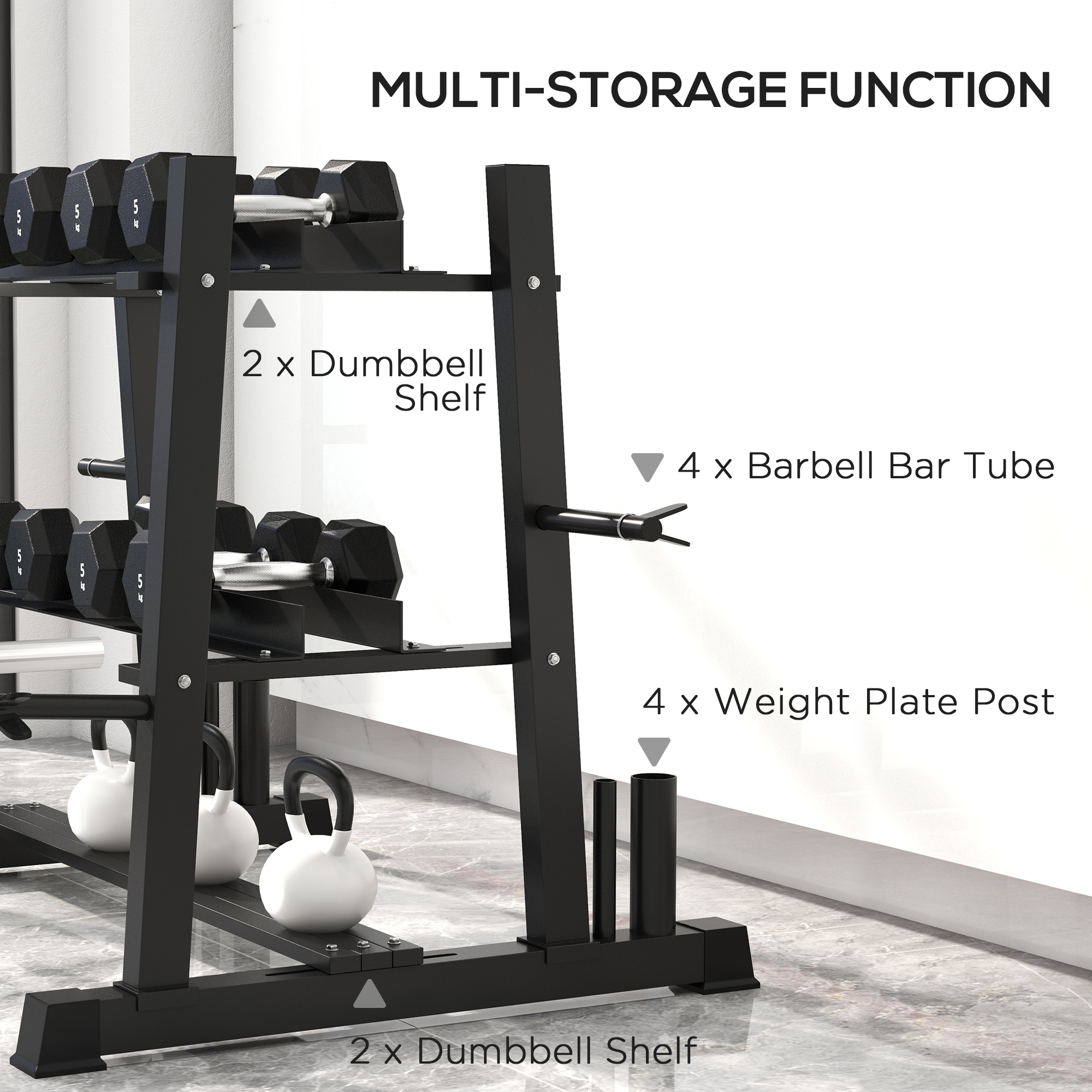 SPORTNOW Ατσάλινο ράφι αλτήρων με 4 ρυθμιζόμενες ράβδους για βάρη και Kettlebells, 131x75x80 cm, Μαύρο A91-298V00BK