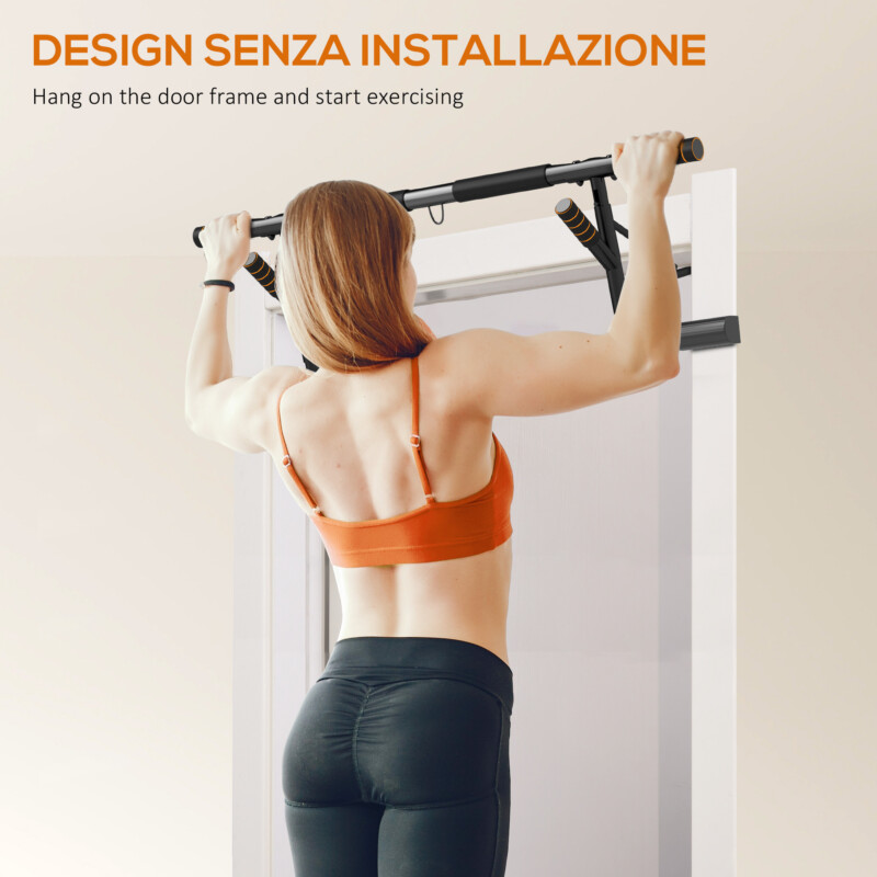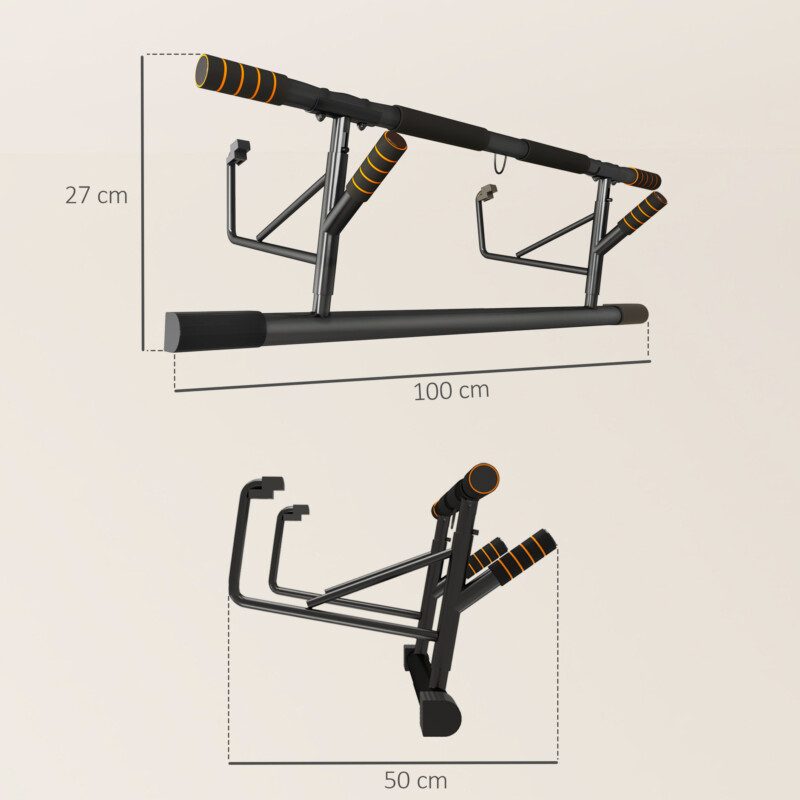 Το εργαλείο δεν χρειάζεται συναρμολόγηση και προσαρμόζεται εύκολα σε πόρτες πλάτους 80-100 cm για να εκτελείτε έλξεις και κάμψεις με ασφάλεια. Η κατασκευή είναι από ανθεκτικό ανθρακούχο χάλυβα με λαβές από αφρό EVA και μπορεί να υποστηρίξει έως και 150 kg.