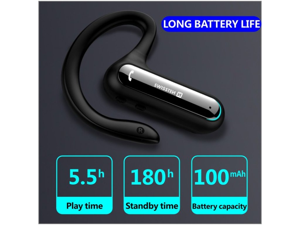 Το SWISSTEN ΑΚΟΥΣΤΙΚΟ είναι από τα πιο μακράς διάρκειας ακουστικά με χρόνο ομιλίας 5.5 ώρες. Σε συνδυασμό με το εργονομικό μινιμαλιστικό σχεδιασμό, είναι πολύ άνετο και κατάλληλο για μεγάλες κλήσεις. Ο γάντζος αυτιού, ο οποίος είναι φτιαγμένος από μαλακό λάστιχο (δεν σπάει και δεν πιέζει το αυτί), συμβάλλει σημαντικά σε μια ασφαλή και ευχάριστη εμπειρία χρήσης.