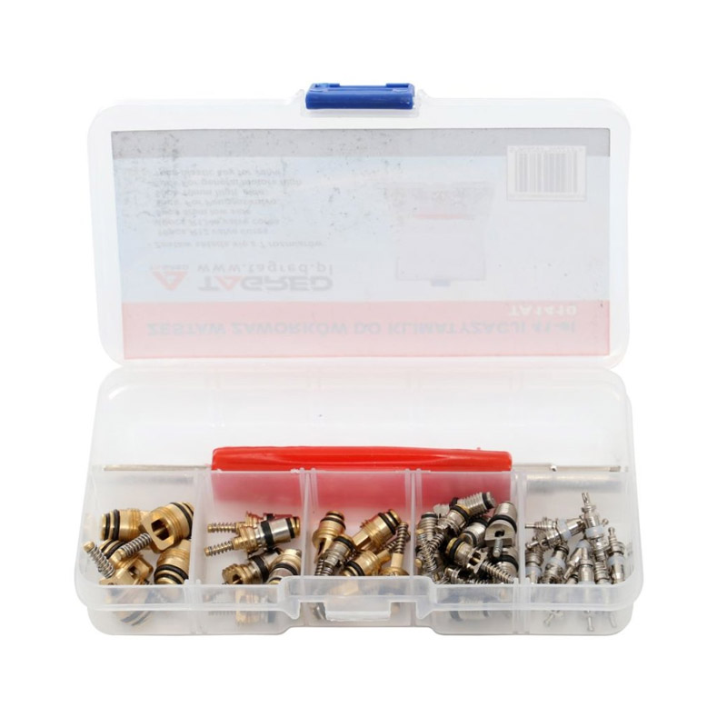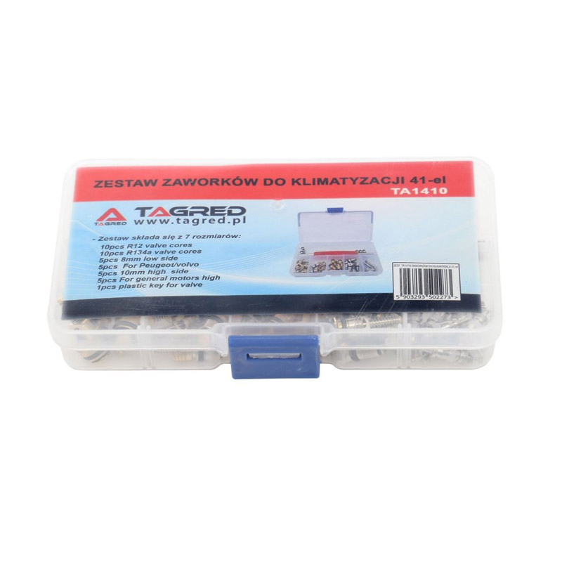 Το σετ, από την εταιρία TAGRED, είναι κατασκευασμένο από υλικά υψηλής ποιότητας. Αποτελείται από βαλβίδες και κλειδί, για το σύστημα κλιματισμού οχημάτων, διαφόρων τύπων.