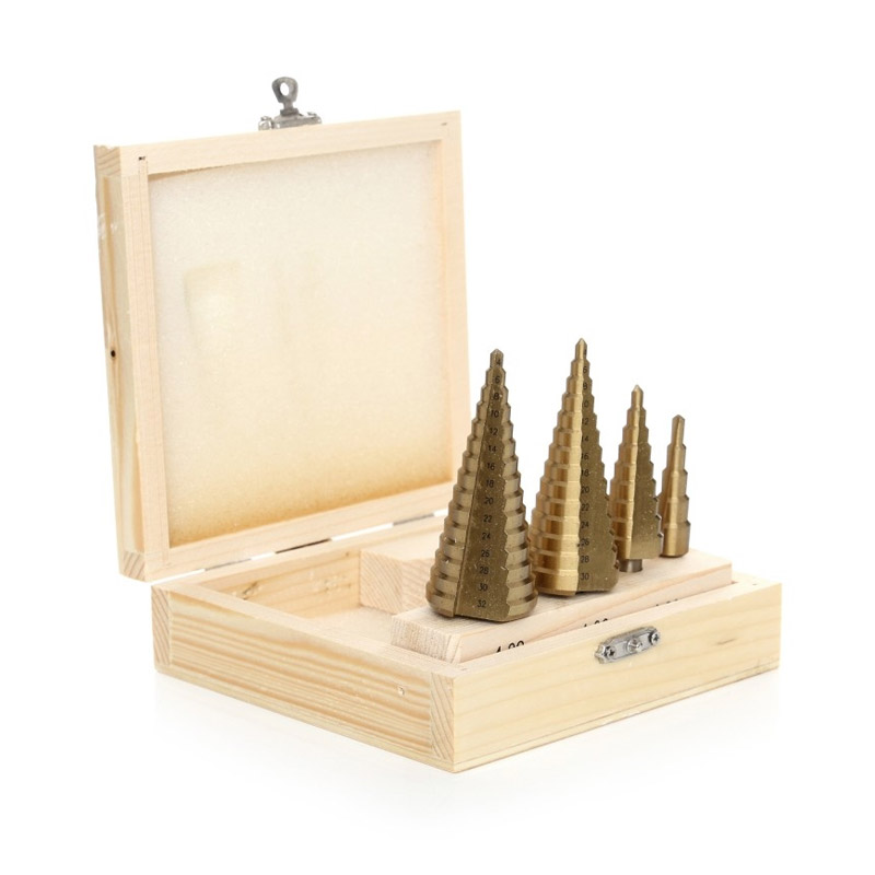 Το σετ από την εταιρεία TAGRED, αποτελείται από 4 κωνικά τρυπάνια, κατασκευασμένα από ατσάλι με επίστρωση τιτανίου, κατάλληλα για διατρήσεις σε πλαστικό, μέταλλα και μαλακό ατσάλι. Συνοδεύονται από ξύλινη κασετίνα μεταφοράς και αποθήκευσης.