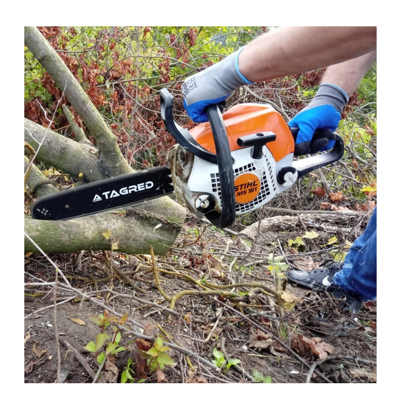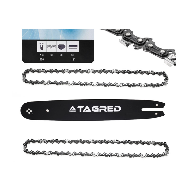 Το σετ, από την εταιρία TAGRED, αποτελείται από λάμα αλυσοπρίονου και 2 αλυσίδες. Η λάμα είναι κατασκευασμένη από πολύ σκληρό υλικό, ανθεκτικό στην τριβή και την υψηλή θερμοκρασία. Οι αλυσίδες έχουν μια ειδική ανθεκτική στη φθορά επίστρωση για αποτελεσματική κοπή ακόμη και σε δύσκολες συνθήκες. Οι επιφάνειες κοπής των δοντιών είναι κατασκευασμένες από κράματα σκληρού μετάλλου και επομένως παραμένουν κοφτερές για μεγαλύτερο χρονικό διάστημα χωρίς επιπλέον ακονισμό σε σύγκριση με άλλες αλυσίδες πριονιού. Τα κανάλια λαδιού στους οδηγούς συνδέσμους συλλέγουν το λάδι και το μεταφέρουν στις αρθρώσεις της αλυσίδας. Ένα επιπλέον δοχείο λαδιού τοποθετείται επίσης σε αυτά τα μέρη, το οποίο παρέχει καλύτερη λίπανση και αυξάνει τη διάρκεια ζωής της αλυσίδας.