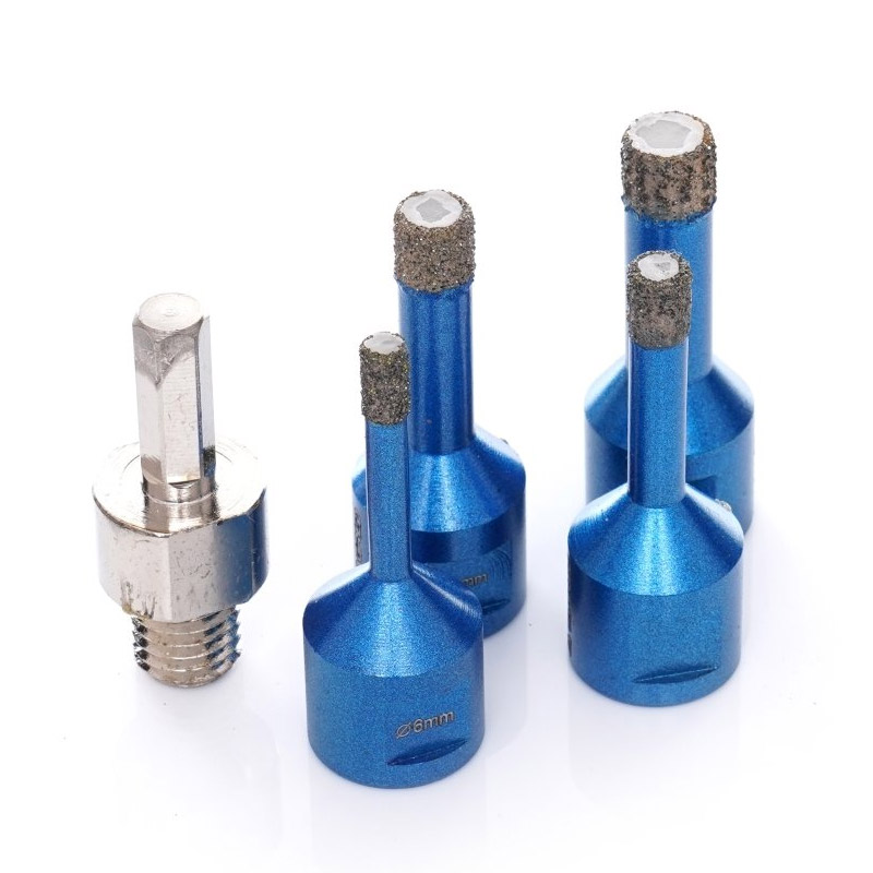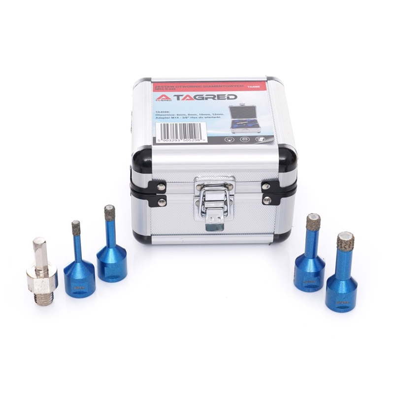Το σετ, από την εταιρία TAGRED, αποτελείται από διαμαντοτρύπανα, ιδανικά για τη διάτρηση χωρίς υγρασία σε πορσελάνινα αντικείμενα, σε κεραμικά, σε μάρμαρα και σκληρά πλακίδια. Είναι κατασκευασμένο από ανθρακούχο ατσάλι υψηλής ποιότητας, με μια πολύ λεπτή και πυκνή επίστρωση διαμαντιού, στο σημείο εργασίας.