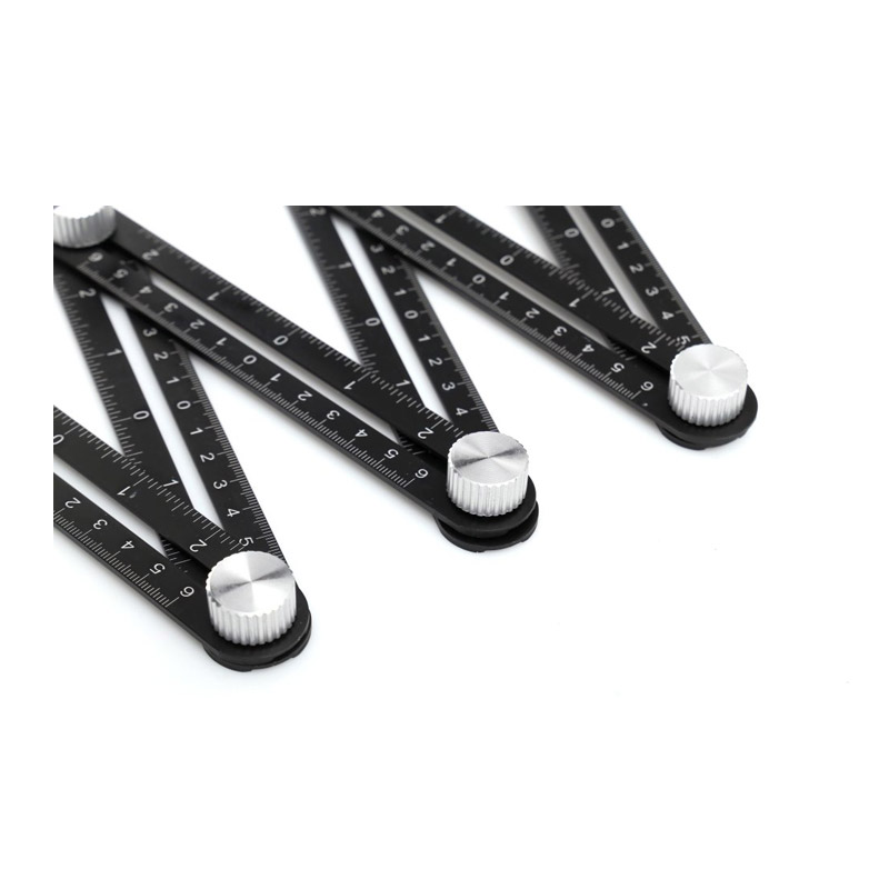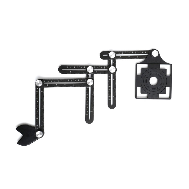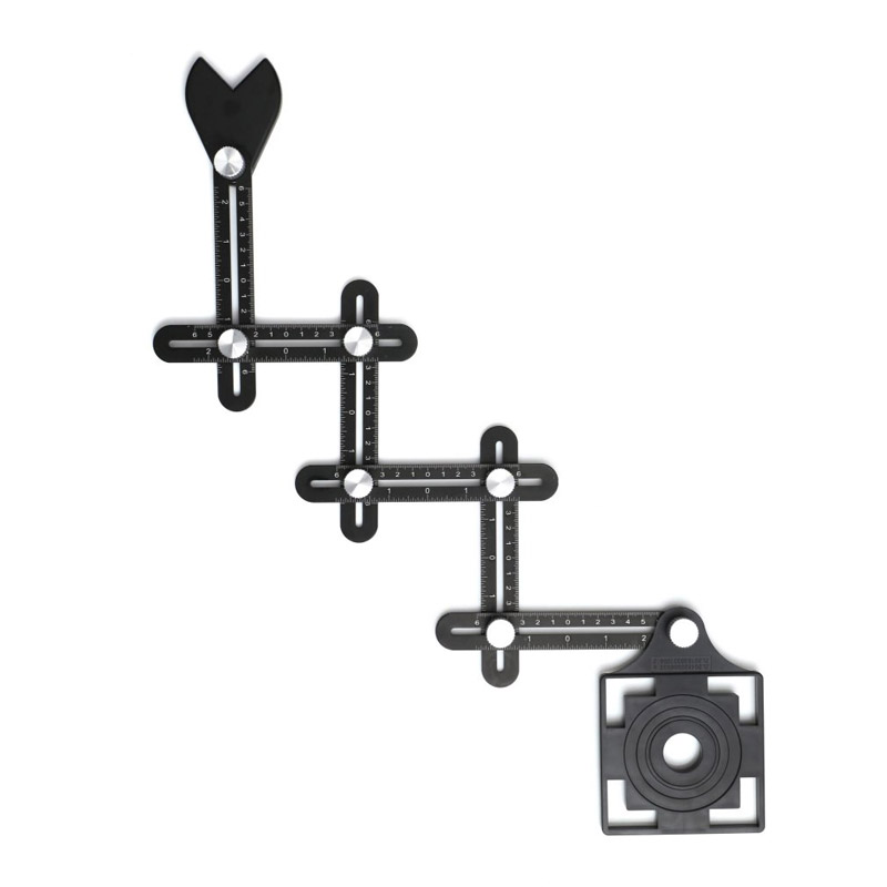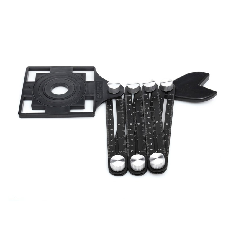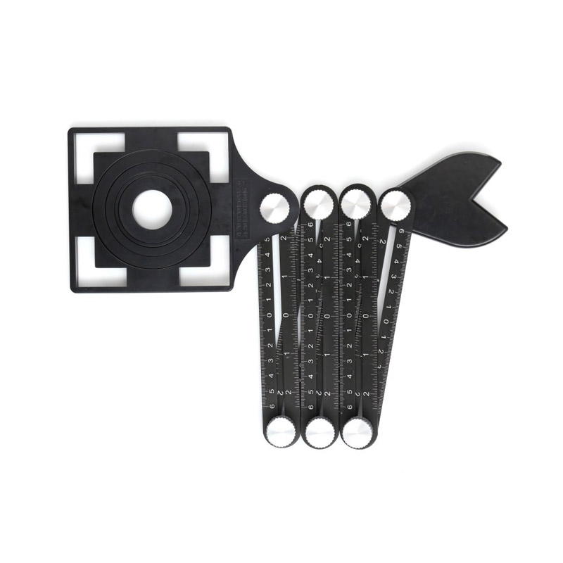 Το μέτρο, αποτελείται από 6 βραχίονες από ανθεκτικό αλουμίνιο, χάρακα οπών 25, 40, 45, 55 και 75 mm και δείκτη ορθής γωνίας.