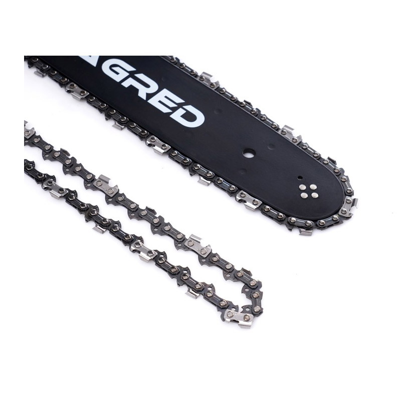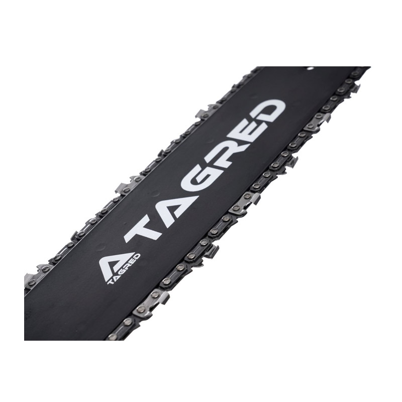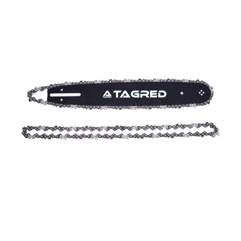Το σετ, από την εταιρία TAGRED, αποτελείται από λάμα αλυσοπρίονου και 2 αλυσίδες. Η λάμα είναι κατασκευασμένη από πολύ σκληρό υλικό, ανθεκτικό στην τριβή και την υψηλή θερμοκρασία. Οι αλυσίδες έχουν μια ειδική ανθεκτική στη φθορά επίστρωση για αποτελεσματική κοπή ακόμη και σε δύσκολες συνθήκες. Οι επιφάνειες κοπής των δοντιών είναι κατασκευασμένες από κράματα σκληρού μετάλλου και επομένως παραμένουν κοφτερές για μεγαλύτερο χρονικό διάστημα χωρίς επιπλέον ακονισμό σε σύγκριση με άλλες αλυσίδες πριονιού. Τα κανάλια λαδιού στους οδηγούς συνδέσμους συλλέγουν το λάδι και το μεταφέρουν στις αρθρώσεις της αλυσίδας.
