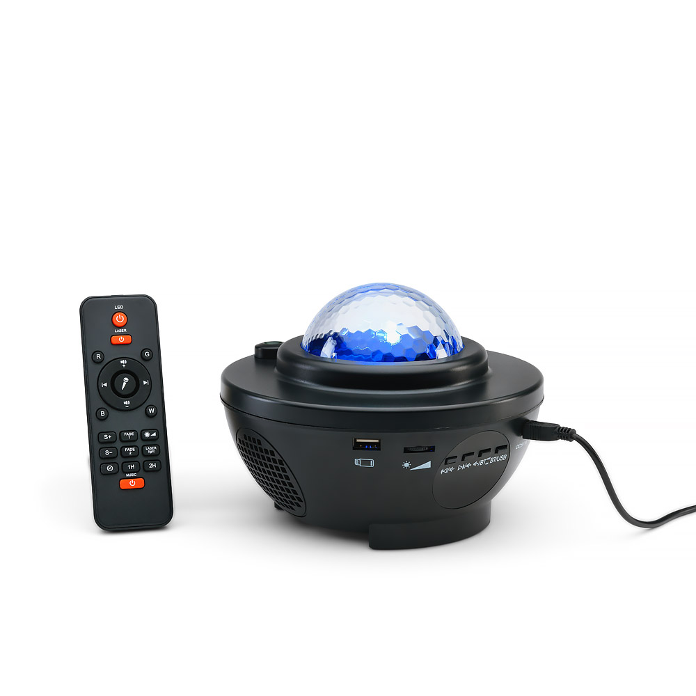 - Χρησιμοποιεί προβολή λέιζερ για να γεμίσει το δωμάτιο με εκατοντάδες αστέρια, ενώ διαθέτει 2 εσωτερικά ηχεία που παρέχουν συνολική έξοδο ήχου 8 Watt