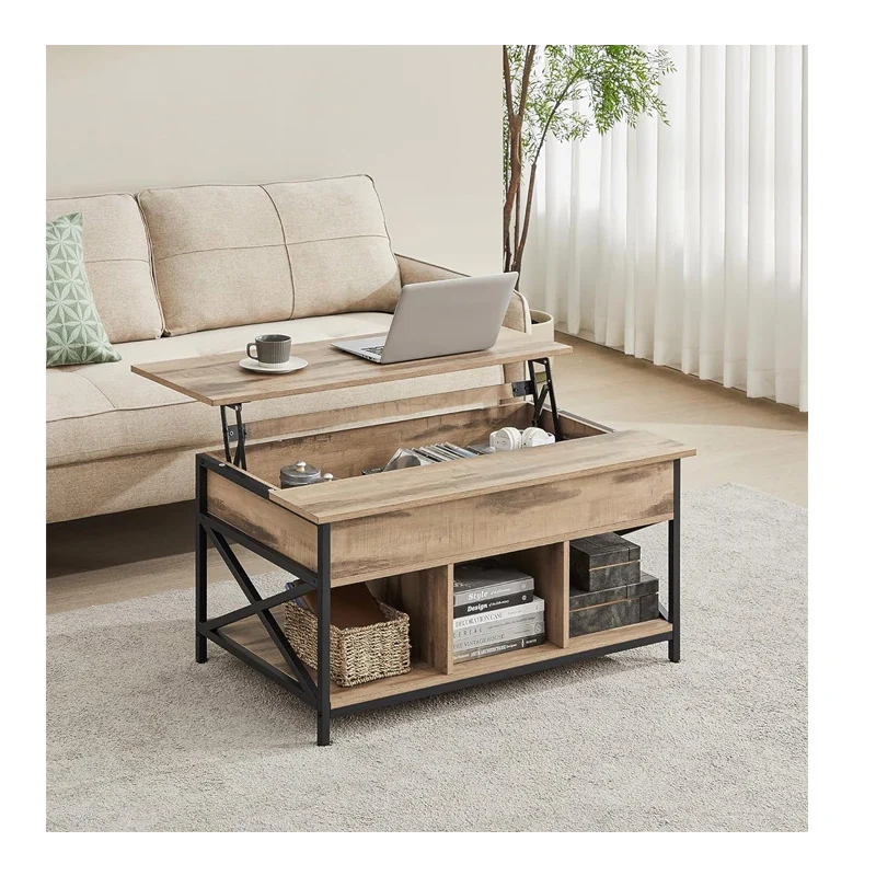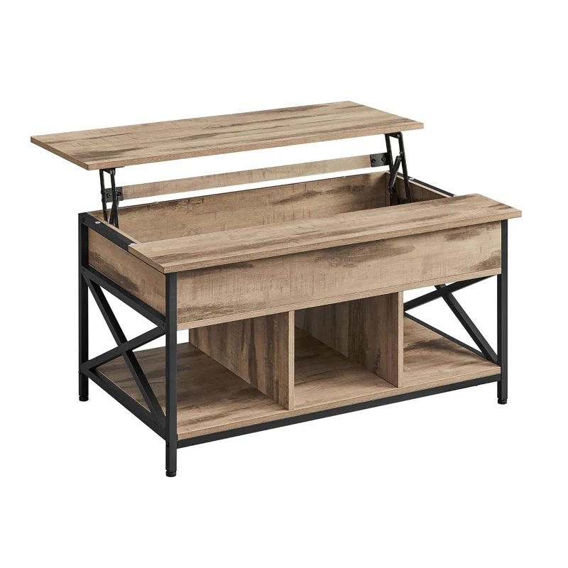 Το τραπέζι σαλονιού, από την εταιρία VASAGLE, διαθέτει ατσάλινο σκελετό και επιφάνειες από μοριοσανίδες υψηλής ποιότητας. Η επιφάνειά του ανοίγει προς τα πάνω δημιουργώντας πρόσθετο αποθηκευτικό χώρο. Στο κάτω μέρος υπάρχουν 3 επιπλέον αποθηκευτικά διαμερίσματα.