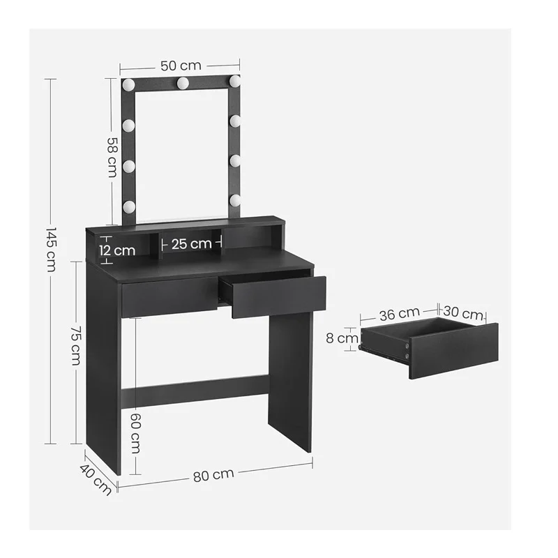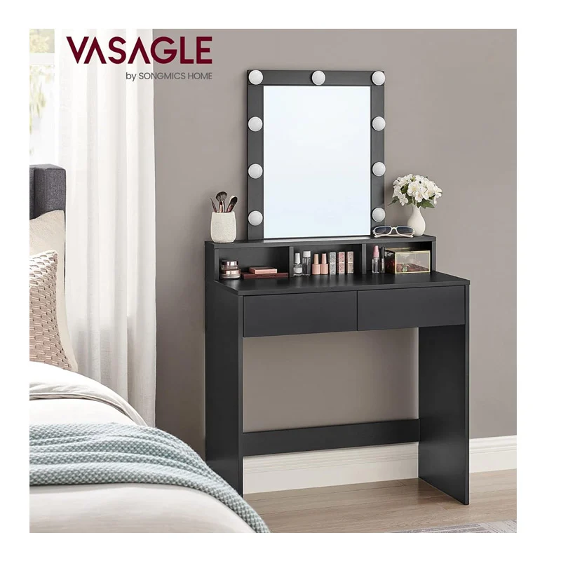 Το μπουντουάρ, από την εταιρία VASAGLE, είναι κατασκευασμένο από MDF ξύλο. Διαθέτει ορθογώνιο καθρέπτη, 2 συρτάρια και 3 ανοιχτές θήκες. Περιμετρικά στον καθρέπτη, υπάρχουν 9 ρυθμιζόμενοι λαμπτήρες, οι οποίοι δημιουργούν επαρκή φωτισμό για το μακιγιάζ σας.