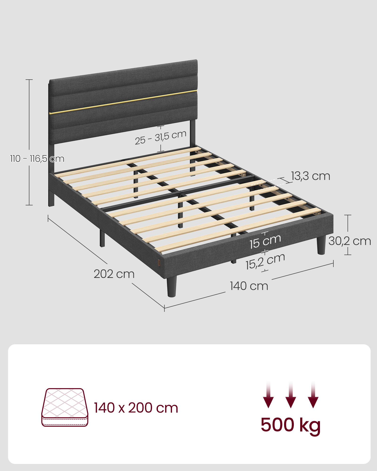 VASAGLE Κρεβάτι Διπλό 201×140.5×116.5 cm με Ρυθμιζόμενο Κεφαλάρι Slate Grey για Στρώμα από Μέταλλο και Ξύλο με διαστάσεις 140×200 cm, RMB504G01