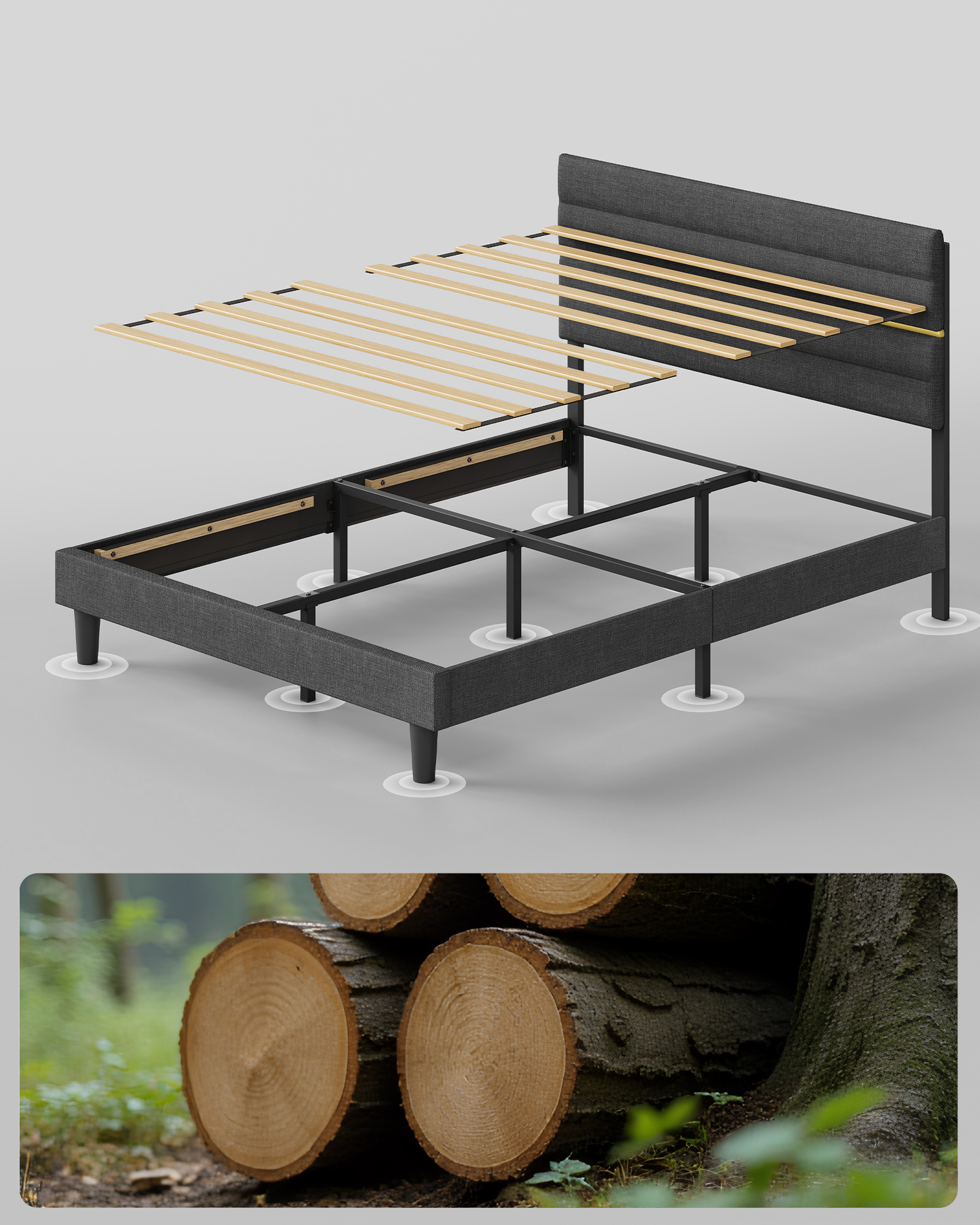 Ο στιβαρός μεταλλικός σκελετός με ανθεκτική στη σκουριά επίστρωση, οι παχιές συμπαγείς ξύλινες τάβλες και τα 9 πόδια διανέμουν αποτελεσματικά την πίεση και παρέχουν στο κρεβάτι βέλτιστη σταθερότητα.