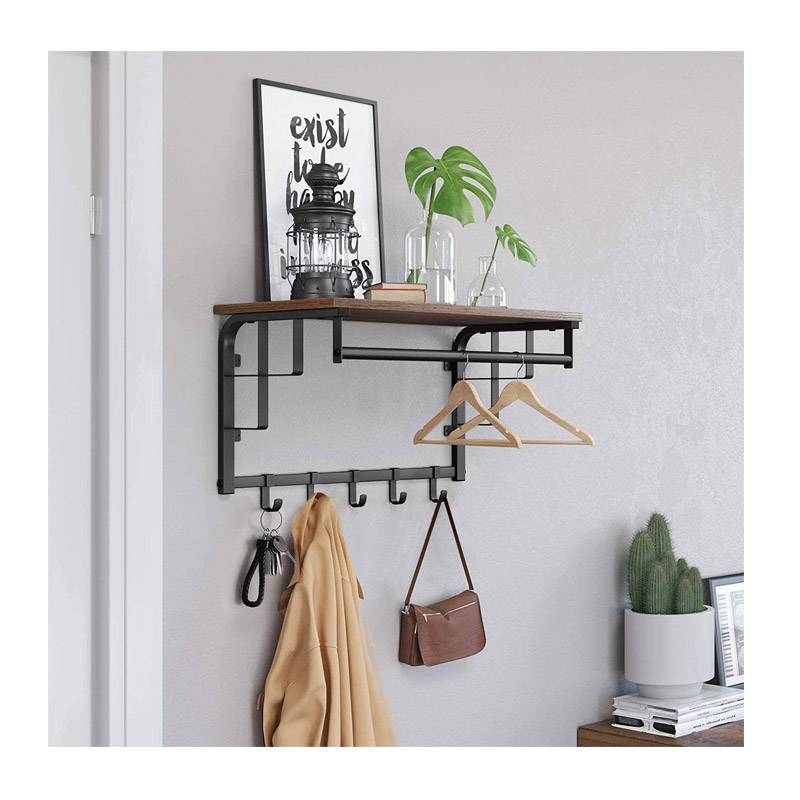 Το επιτοίχιο ράφι, από την εταιρία VASAGLE, διαθέτει μεταλλικό σκελετό και επιφάνεια από μοριοσανίδες σε ρουστίκ καφέ απόχρωση. Επιπρόσθετα, περιλαμβάνει 5 ανθεκτικά άγκιστρα για να κρεμάτε μπουφάν, παλτό, σακάκια, τσάντες, καθώς και 1 ράγα για κρεμάστρες.