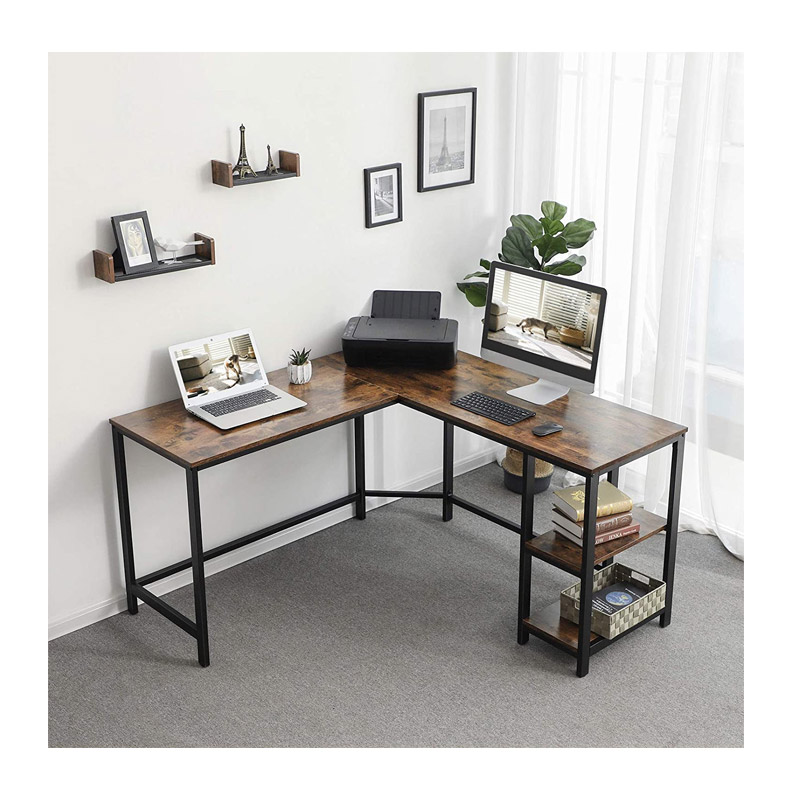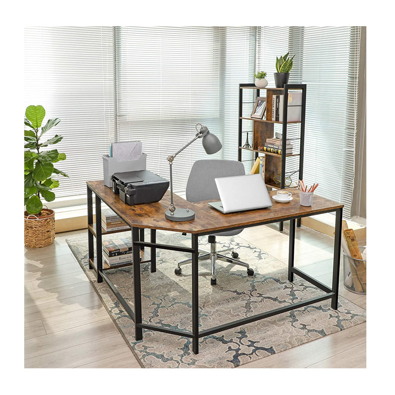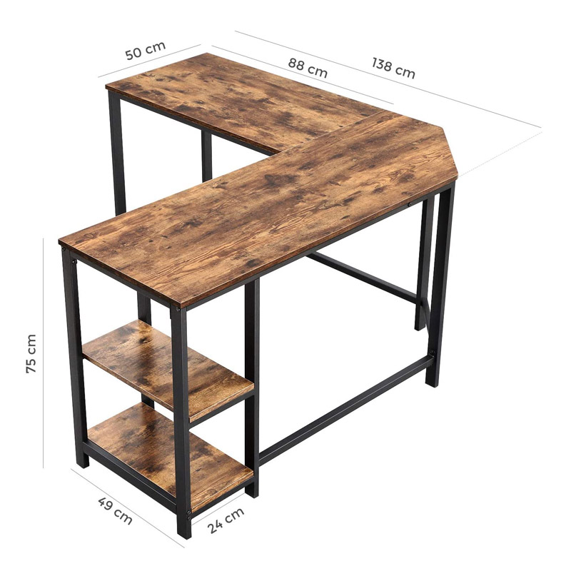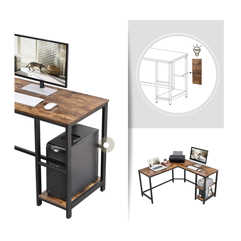 Το γωνιακό γραφείο σε σχήμα L, από την εταιρία VASAGLE, διαθέτει ατσάλινο πλαίσιο και επιφάνεια από μοριοσανίδες σε ρουστίκ καφέ φινίρισμα. Στο κάτω μέρος διαθέτει 2 ράφια, με το πάνω ράφι αφαιρούμενο για να δημιουργηθεί χώρος για έναν πύργο υπολογιστή.