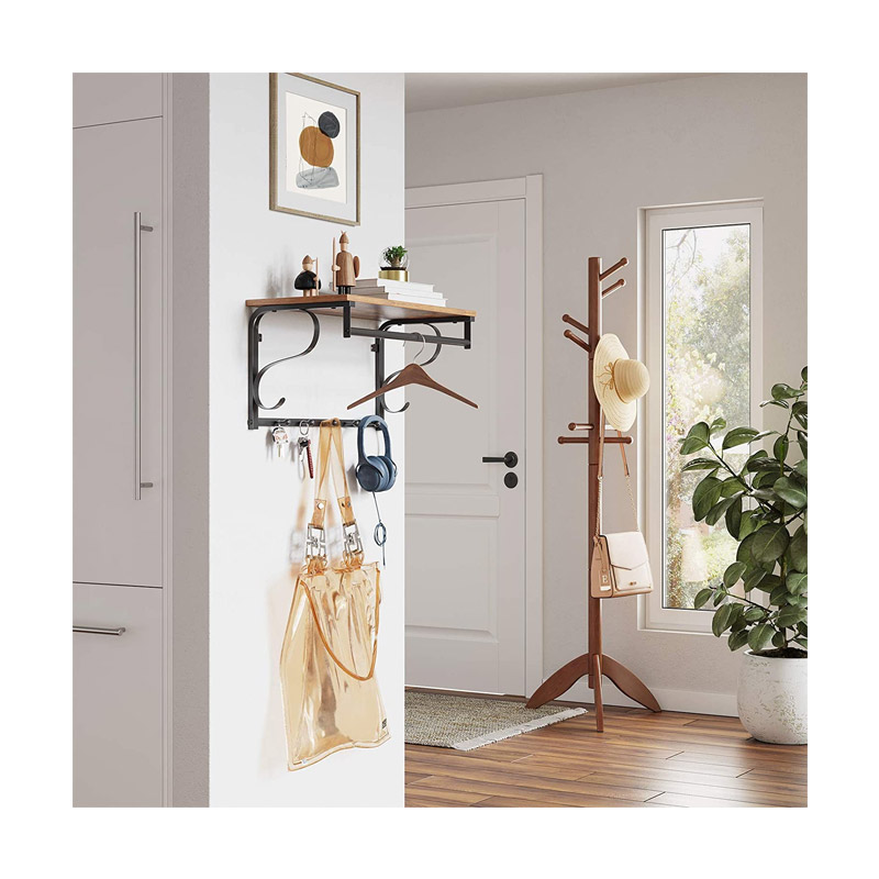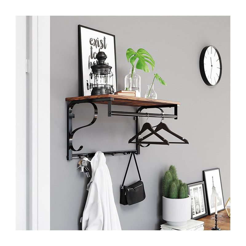 Το επιτοίχιο ράφι, από την εταιρία VASAGLE, διαθέτει μεταλλικό σκελετό από ατσάλι και επιφάνεια από μοριοσανίδες σε ρουστίκ καφέ απόχρωση. Επιπρόσθετα, περιλαμβάνει 5 ανθεκτικά άγκιστρα για να κρεμάτε μπουφάν, παλτό, σακάκια, τσάντες, καθώς και 1 ράγα για κρεμάστρες.