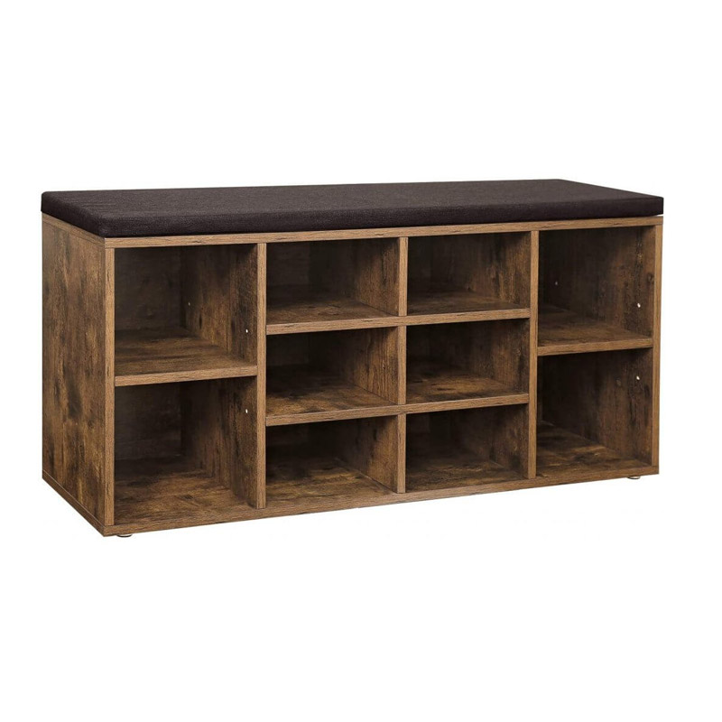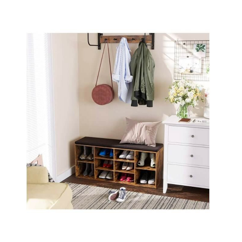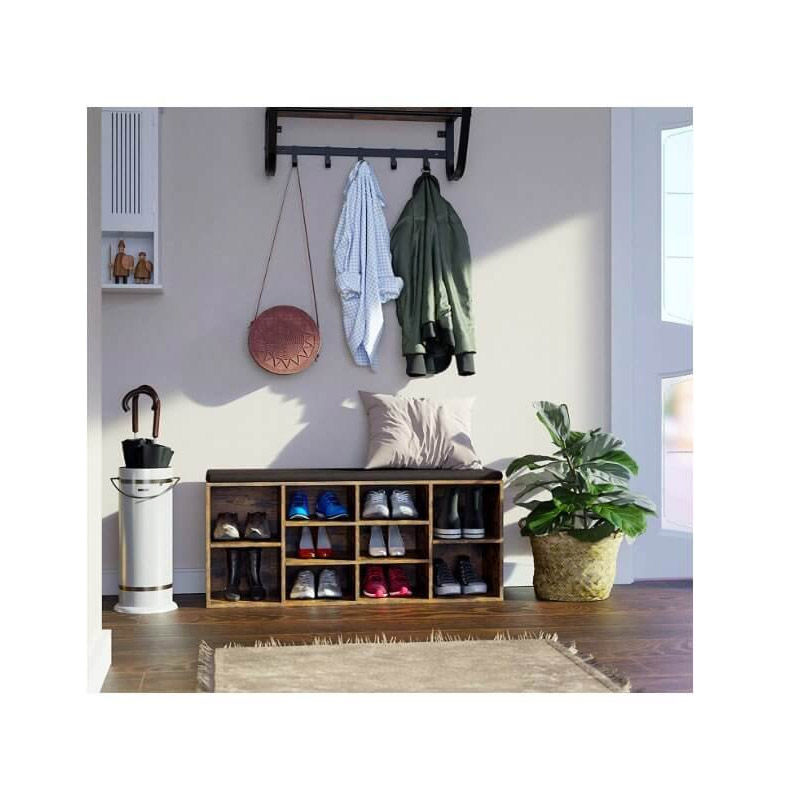 Ο πάγκος, από την εταιρία VASAGLE, έχει στοιβαρή δομή και είναι κατασκευασμένος από μοριοσανίδα E1. Διαθέτει αφαιρούμενο μαξιλάρι από λινό ύφασμα με εύκολο καθαρισμό και 10 διαμερίσματα για τα παπούτσια σας. Οι διαχωριστές στα πλευρικά διαμερίσματα μπορούν να αφαιρεθούν ή να ρυθμιστούν για μεγαλύτερο ύψος. Έχει εύκολη συναρμολόγηση και μπορείτε να τον τοποθετήσετε και κάθετα μετατρέποντας το σε βιτρίνα (αφαιρώντας το μαξιλάρι), για να διακοσμήσετε το σαλόνι σας.