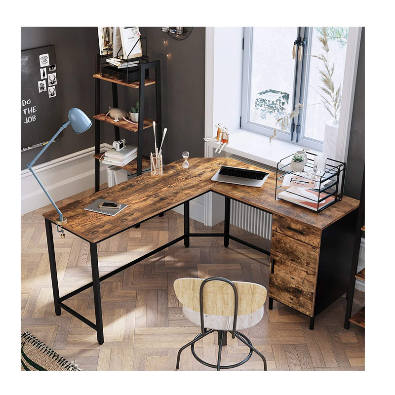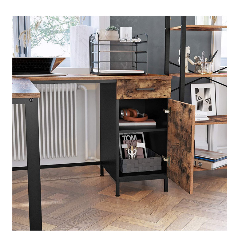 Το γωνιακό γραφείο σε σχήμα L, από την εταιρία VASAGLE, διαθέτει ατσάλινο πλαίσιο και επιφάνεια από μοριοσανίδες σε ρουστίκ καφέ φινίρισμα. Στο κάτω μέρος διαθέτει 1 ευρύχωρο συρτάρι και 1 ντουλάπι με 2 ράφια.