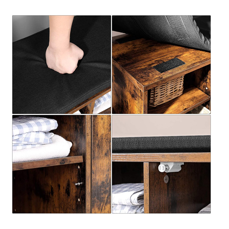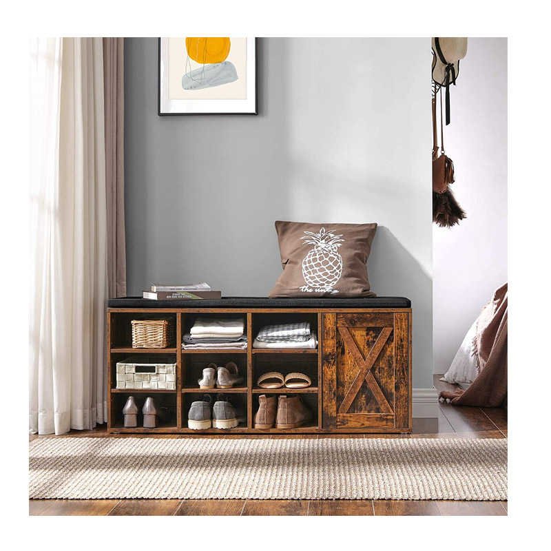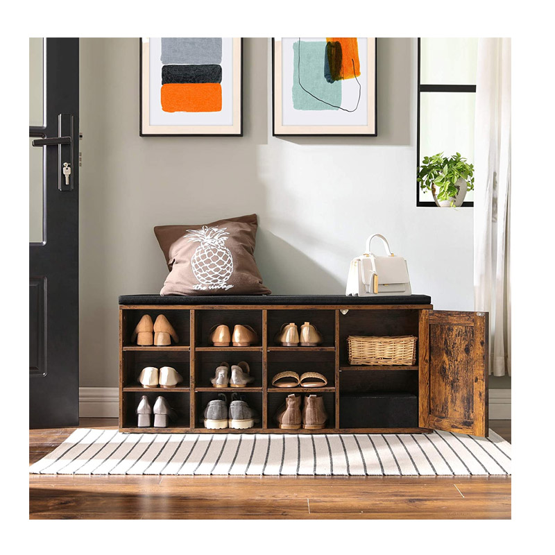 Ο πάγκος, από την εταιρία VASAGLE, έχει στιβαρή δομή και είναι κατασκευασμένος από μοριοσανίδα. Διαθέτει 9 ανοιχτά διαμερίσματα για την οργάνωση των παπουτσιών σας, στα οποία μπορείτε να τοποθετήσετε παπούτσια έως το νούμερο 44. Τα ράφια μπορούν να αφαιρεθούν και είναι ρυθμιζόμενα σε 3 επίπεδα.