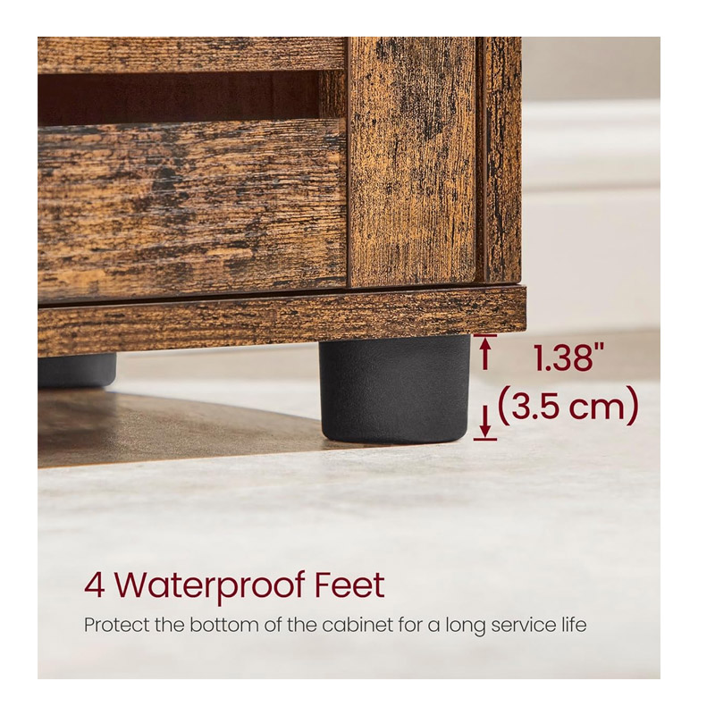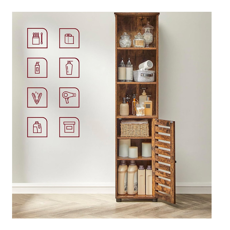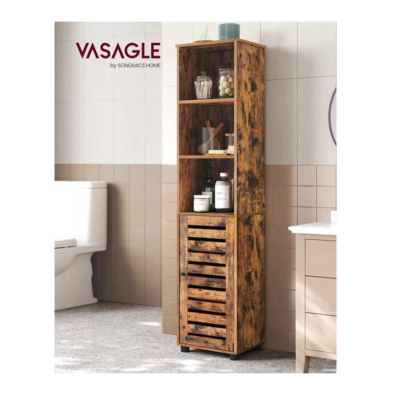 Η στήλη μπάνιου, από την εταιρία VASAGLE, είναι κατασκευασμένη από υψηλής ποιότητας μοριοσανίδες. Διαθέτει 3 ανοιχτά ράφια και 1 ντουλάπι. Το ντουλάπι στο εσωτερικό του έχει 3 ράφια, τα 2 εκ των οποίων είναι ρυθμιζόμενα σε ύψος.