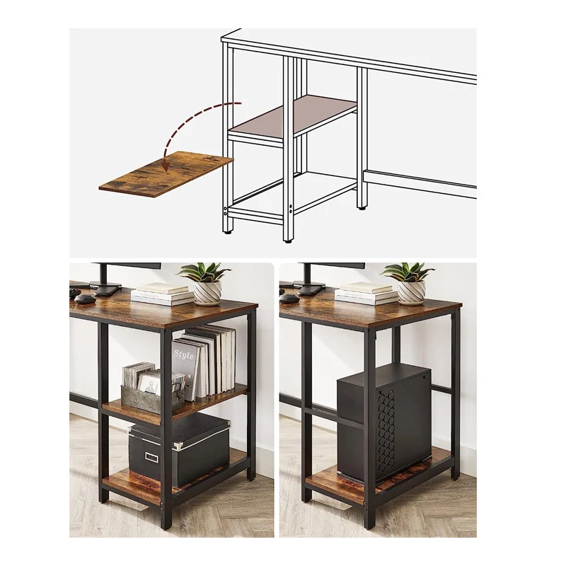 Το γραφείο, από την εταιρία VASAGLE, διαθέτει μεταλλικό σκελετό από ατσάλι και επιφάνεια από μοριοσανίδες σε ρουστίκ καφέ απόχρωση. Είναι αρκετά μεγάλο για να χωρέσει έναν υπολογιστή, εκτυπωτή, βιβλία, ακόμη και λίγο χώρο για φυτά σε γλάστρες. Έχει 2 πλαϊνά ράφια τα οποία μπορούν να τοποθετηθούν είτε στη δεξιά είτε στη αριστερή πλευρά του γραφείου. Επιπλέον το ένα ράφι μπορεί να αφαιρεθεί ώστε να τοποθετήσετε με άνεση τον πύργο του υπολογιστή σας. Έχει άφθονο χώρο για τα πόδια σας, ενώ μπορεί να χωρέσει εύκολα την καρέκλα από κάτω.