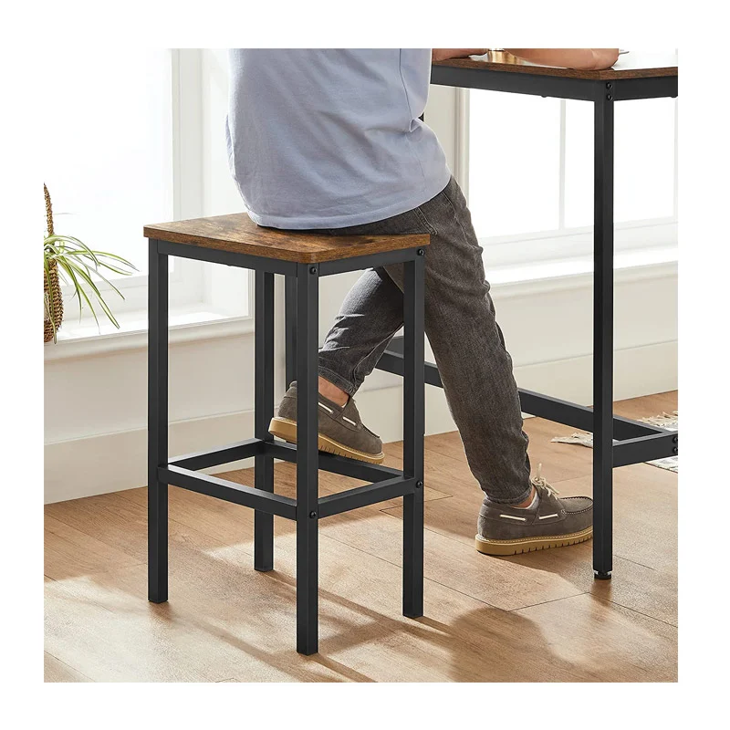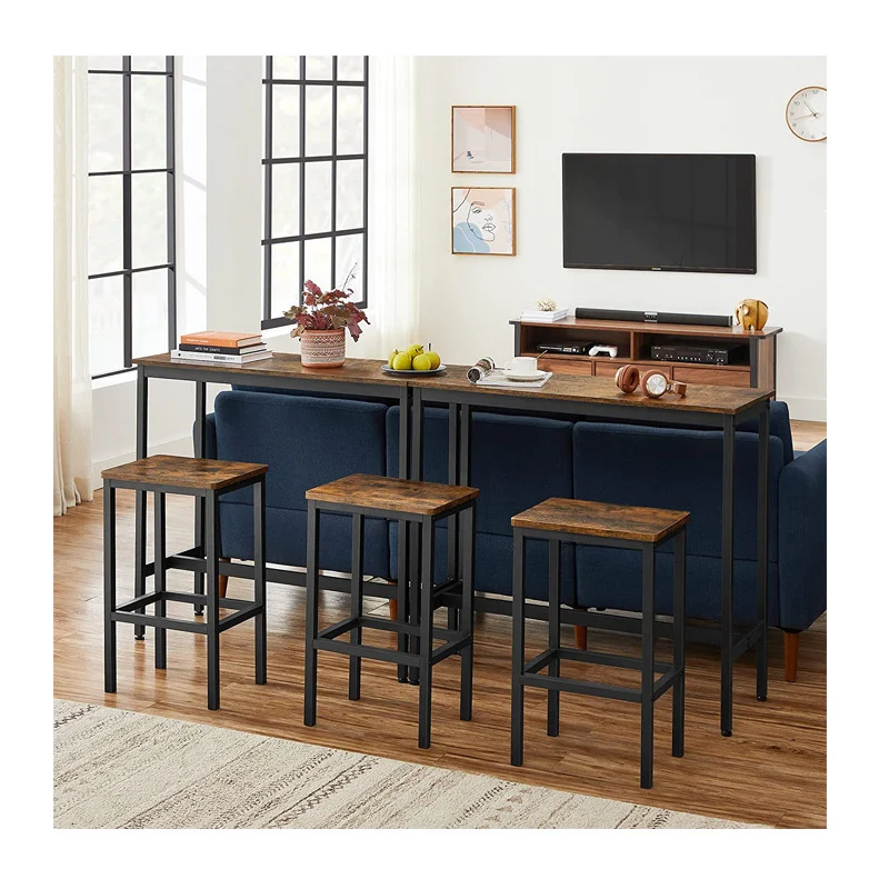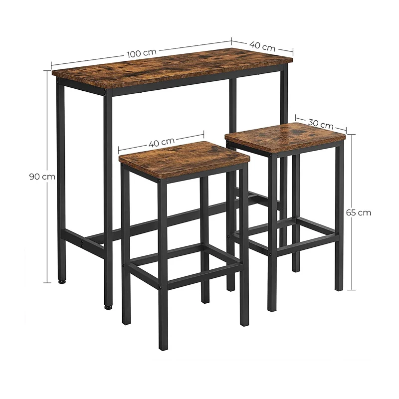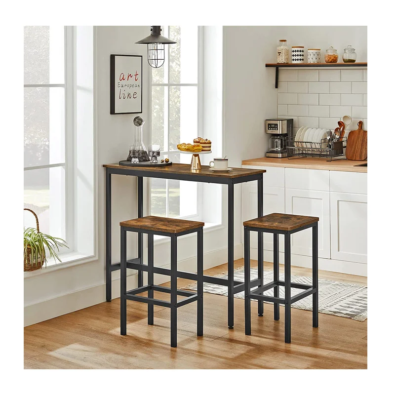 Το σετ, από την εταιρία VASAGLE, αποτελείται από ένα μεταλλικό ορθογώνιο τραπέζι – bar και 2 σκαμπό. Τα έπιπλα του σετ, διαθέτουν σκελετό από ανθεκτικό ατσάλι και επιφάνεια από στιβαρή μοριοσανίδα, σε ρουστίκ καφέ απόχρωση. Ο συμπαγής σχεδιασμός, με τις καρέκλες να μπορούν να τοποθετηθούν τακτοποιημένα κάτω από το τραπέζι, βοηθάει στην εξοικονόμηση χώρου.