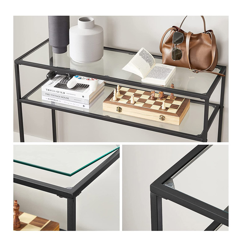 Η κονσόλα, από την εταιρία VASAGLE, διαθέτει σκελετό από μαύρο ατσάλι και 2 ράφια από σκληρυμένο γυαλί.